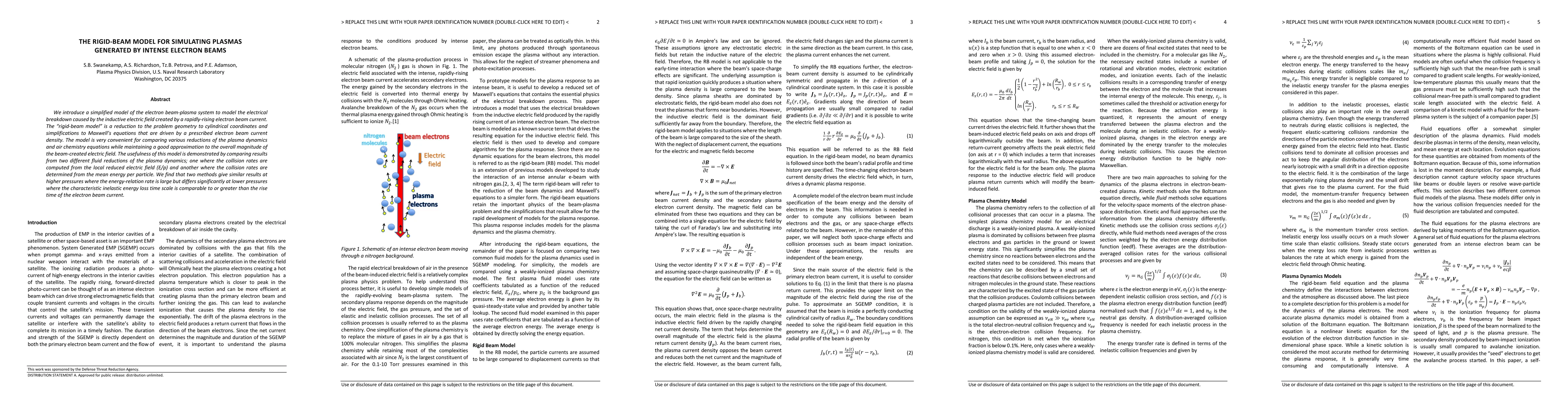 The paper introduces a simplified model, the rigid-beam model, for simulating plasmas generated by intense electron beams. This model reduces the problem geometry to cylindrical coordinates and simplifies Maxwell's equations driven by a prescribed electron beam current density.