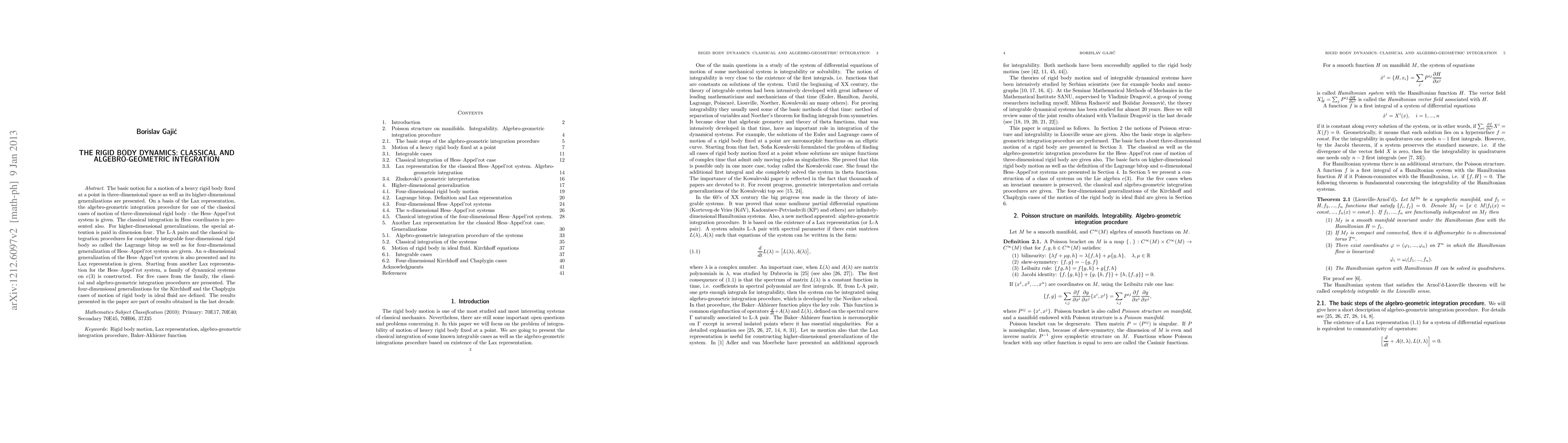 The basic notion for a motion of a heavy rigid body fixed at a point in three-dimensional space as well as its higher-dimensional generalizations are presented. On a basis of Lax representation, the algebro-geometric integration procedure for one of the classical cases of motion of three-dimensional rigid body - the Hess-Appel'rot system is given. The classical integration in Hess coordinates is presented also. For higher-dimensional generalizations, the special attention is paid in dimension four. The L-A pairs and the classical integration procedures for completely integrable four-dimensional rigid body so called the Lagrange bitop as well as for four-dimensional generalization of Hess-Appel'rot system are given. An $n$-dimensional generalization of the Hess-Appel'rot system is also presented and its Lax representation is given. Starting from another Lax representation for the Hess-Appel'rot system, a family of dynamical systems on $e(3)$ is constructed. For five cases from the family, the classical and algebro-geometric integration procedures are presented. The four-dimensional generalizations for the Kirchhoff and the Chaplygin cases of motion of rigid body in ideal fluid are defined. The results presented in the paper are part of results obtained in last decade.