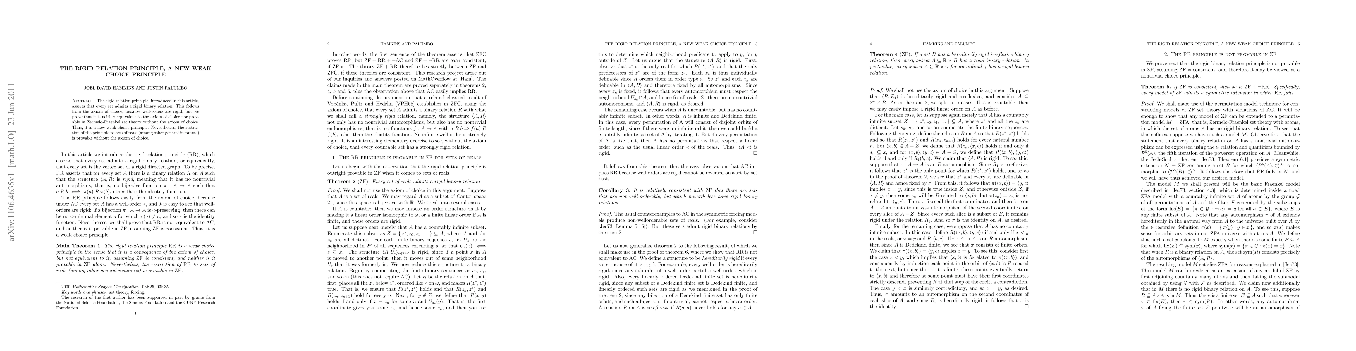 The rigid relation principle posits that every set can be endowed with a rigid binary relation, a concept derived from the axiom of choice but not equivalent to it or provable in ZF set theory without choice. Its restriction to sets of reals is provable without the axiom of choice.