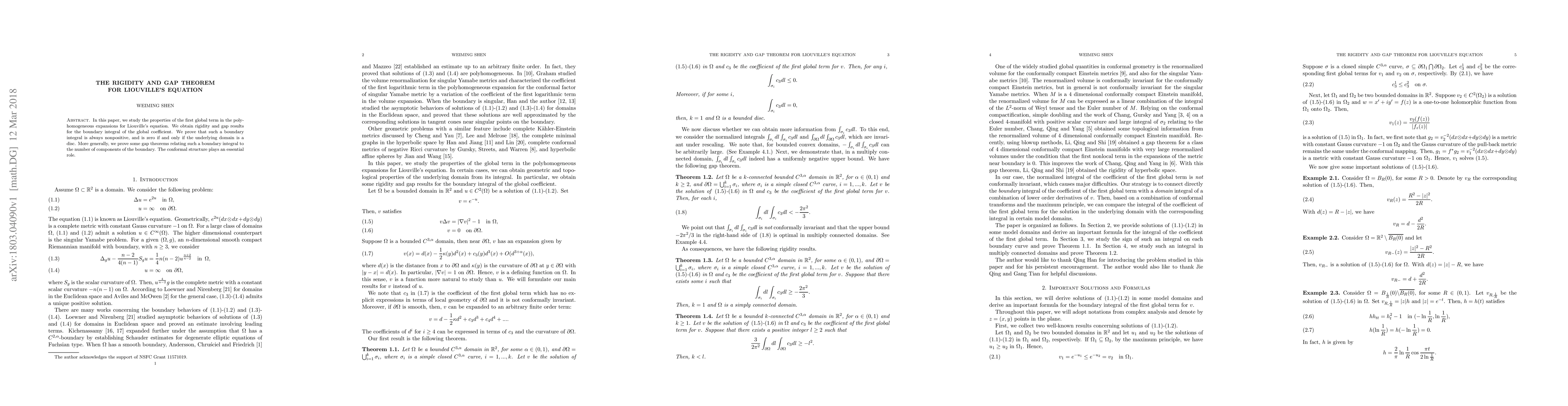 In this paper, we study the properties of the first global term in the polyhomogeneous expansions for Liouville's equation. We obtain rigidity and gap results for the boundary integral of the global coefficient. We prove that such a boundary integral is always nonpositive, and is zero if and only if the underlying domain is a disc. More generally, we prove some gap theorems relating such a boundary integral to the number of components of the boundary. The conformal structure plays an essential role.