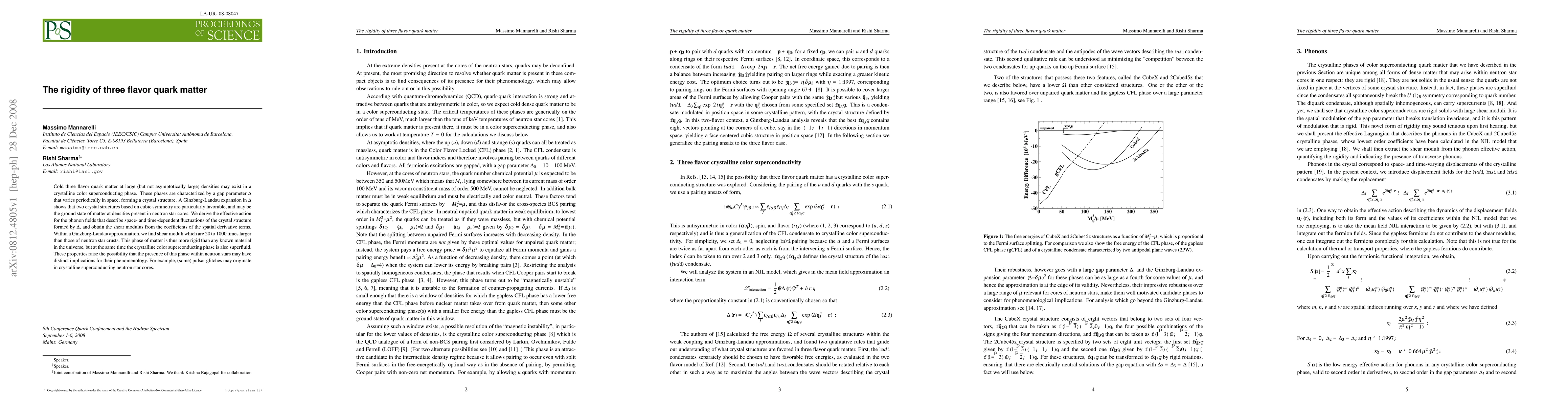 Cold three flavor quark matter at large (but not asymptotically large) densities may exist in a crystalline color superconducting phase. These phases are characterized by a gap parameter $\Delta$ that varies periodically in space, forming a crystal structure. A Ginzburg-Landau expansion in $\Delta$ shows that two crystal structures based on cubic symmetry are particularly favorable, and may be the ground state of matter at densities present in neutron star cores. We derive the effective action for the phonon fields that describe space- and time-dependent fluctuations of the crystal structure formed by $\Delta$, and obtain the shear modulus from the coefficients of the spatial derivative terms. Within a Ginzburg-Landau approximation, we find shear moduli which are 20 to 1000 times larger than those of neutron star crusts. This phase of matter is thus more rigid than any known material in the universe, but at the same time the crystalline color superconducting phase is also superfluid. These properties raise the possibility that the presence of this phase within neutron stars may have distinct implications for their phenomenology. For example, (some) pulsar glitches may originate in crystalline superconducting neutron star cores.