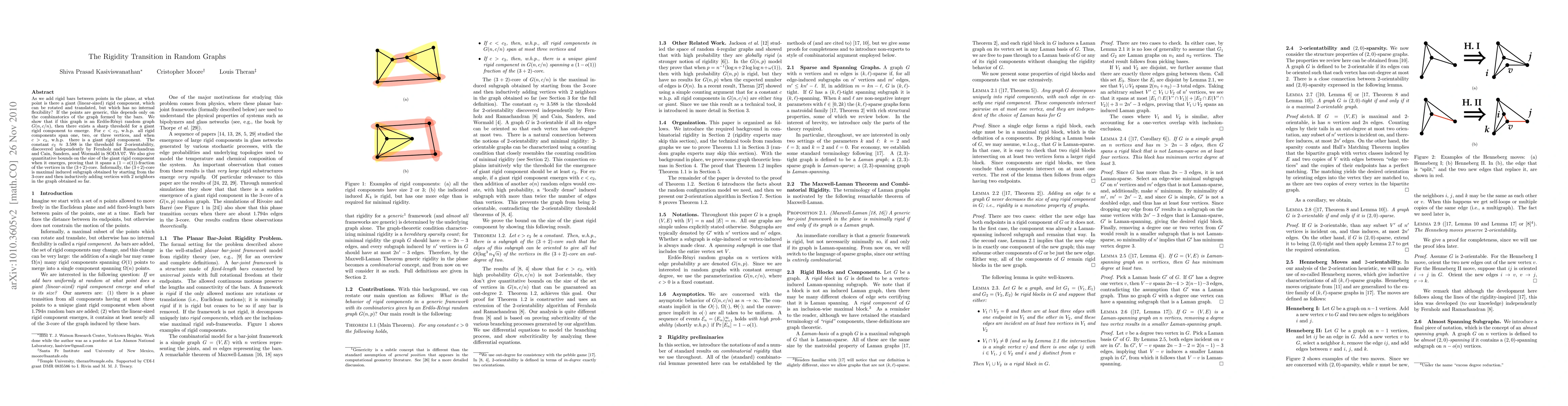 As we add rigid bars between points in the plane, at what point is there a giant (linear-sized) rigid component, which can be rotated and translated, but which has no internal flexibility? If the points are generic, this depends only on the combinatorics of the graph formed by the bars. We show that if this graph is an Erdos-Renyi random graph G(n,c/n), then there exists a sharp threshold for a giant rigid component to emerge. For c < c_2, w.h.p. all rigid components span one, two, or three vertices, and when c > c_2, w.h.p. there is a giant rigid component. The constant c_2 \approx 3.588 is the threshold for 2-orientability, discovered independently by Fernholz and Ramachandran and Cain, Sanders, and Wormald in SODA'07. We also give quantitative bounds on the size of the giant rigid component when it emerges, proving that it spans a (1-o(1))-fraction of the vertices in the (3+2)-core. Informally, the (3+2)-core is maximal induced subgraph obtained by starting from the 3-core and then inductively adding vertices with 2 neighbors in the graph obtained so far.