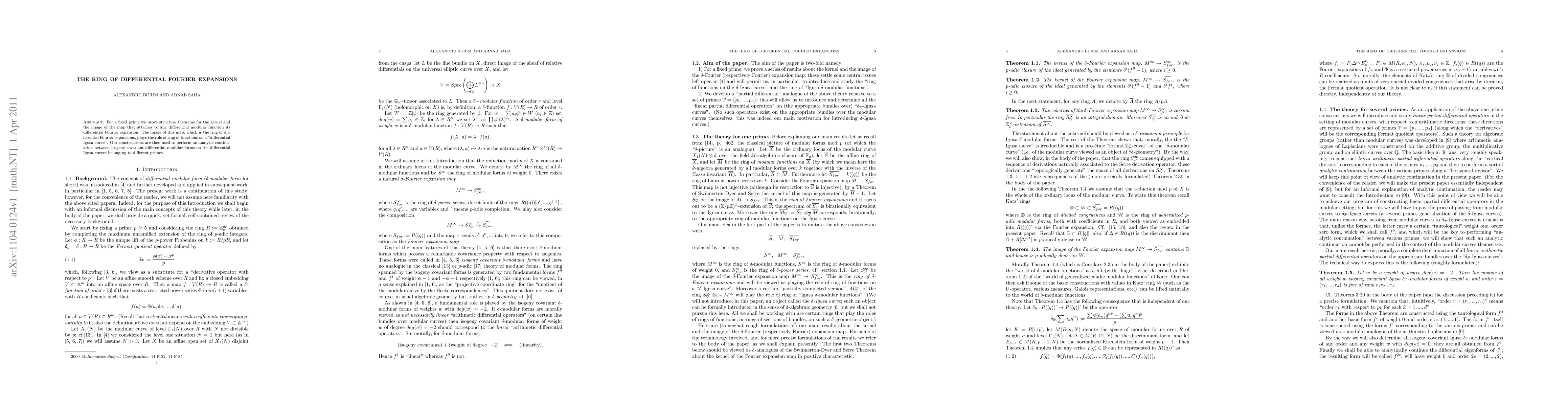 For a fixed prime we prove structure theorems for the kernel and the image of the map that attaches to any differential modular function its differential Fourier expansion. The image of this map, which is the ring of differential Fourier expansions, plays the role of ring of functions on a "differential Igusa curve". Our constructions are then used to perform an analytic continuation between isogeny covariant differential modular forms on the differential Igusa curves belonging to different primes.