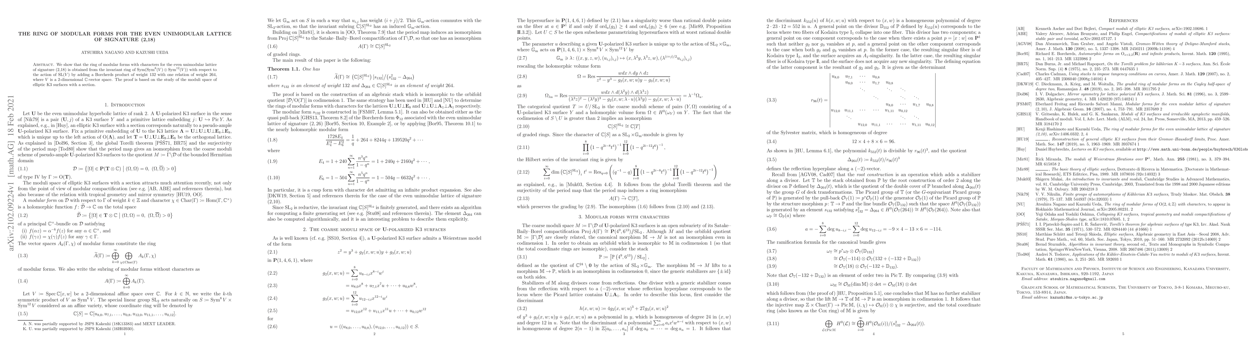 The paper demonstrates that the ring of modular forms for the even unimodular lattice of signature (2,18) originates from the invariant ring of Sym(Sym^8(V) ⊕ Sym^12(V)) under SL(V) action, enhanced by a Borcherds product of weight 132 and one relation of weight 264. This is proven through an analysis of the moduli space of elliptic K3 surfaces with a section.
