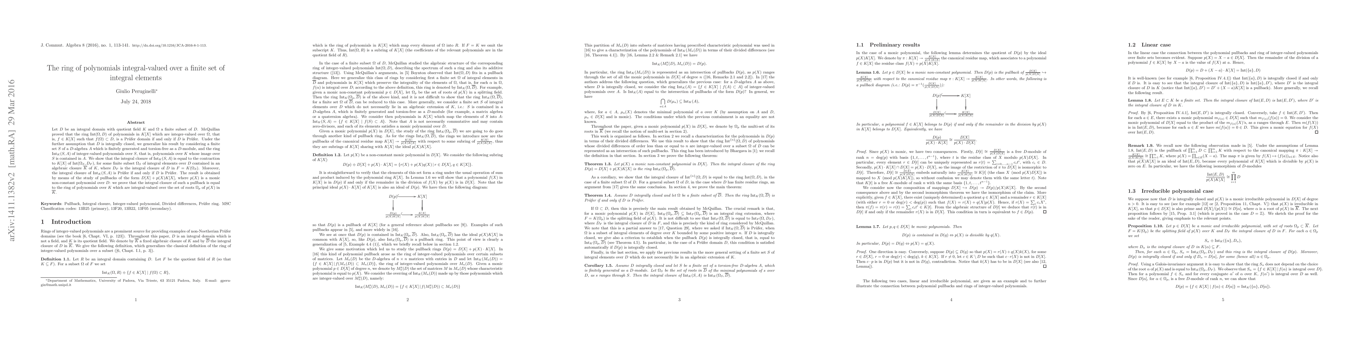 Let $D$ be an integral domain with quotient field $K$ and $\Omega$ a finite subset of $D$. McQuillan proved that the ring ${\rm Int}(\Omega,D)$ of polynomials in $K[X]$ which are integer-valued over $\Omega$, that is, $f\in K[X]$ such that $f(\Omega)\subset D$, is a Pr\"ufer domain if and only if $D$ is Pr\"ufer. Under the further assumption that $D$ is integrally closed, we generalize his result by considering a finite set $S$ of a $D$-algebra $A$ which is finitely generated and torsion-free as a $D$-module, and the ring ${\rm Int}_K(S,A)$ of integer-valued polynomials over $S$, that is, polynomials over $K$ whose image over $S$ is contained in $A$. We show that the integral closure of ${\rm Int}_K(S,A)$ is equal to the contraction to $K[X]$ of ${\rm Int}(\Omega_S,D_F)$, for some finite subset $\Omega_S$ of integral elements over $D$ contained in an algebraic closure $\bar K$ of $K$, where $D_F$ is the integral closure of $D$ in $F=K(\Omega_S)$. Moreover, the integral closure of ${\rm Int}_K(S,A)$ is Pr\"ufer if and only if $D$ is Pr\"ufer. The result is obtained by means of the study of pullbacks of the form $D[X]+p(X)K[X]$, where $p(X)$ is a monic non-constant polynomial over $D$: we prove that the integral closure of such a pullback is equal to the ring of polynomials over $K$ which are integral-valued over the set of roots $\Omega_p$ of $p(X)$ in $\bar K$.