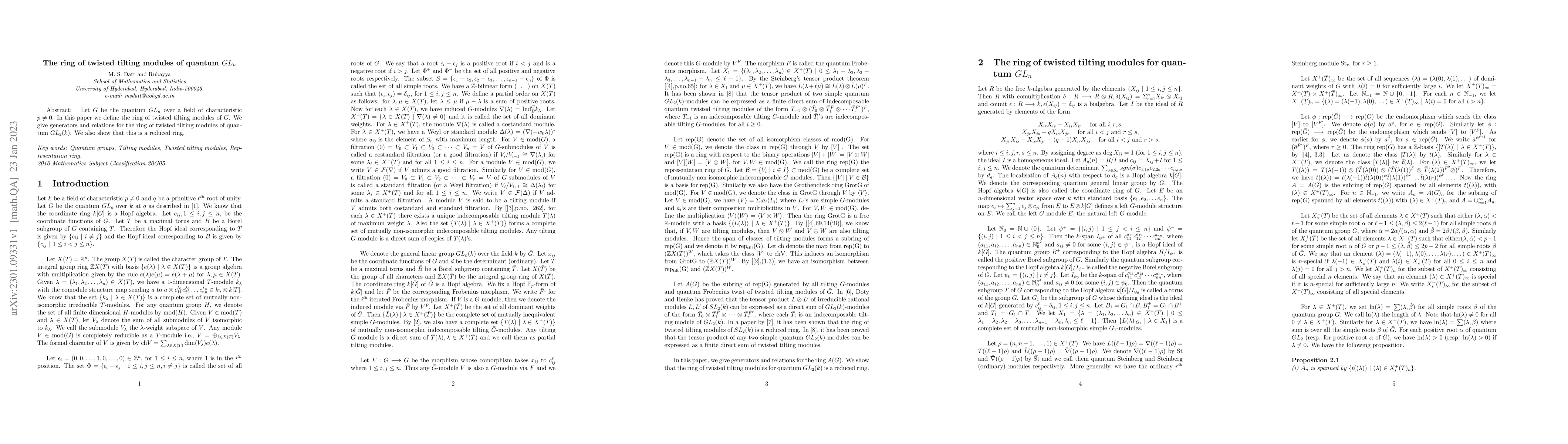 This paper defines the ring of twisted tilting modules for quantum $GL_n$ and provides generators and relations for the specific case of quantum $GL_2(k)$. It demonstrates that this ring is a reduced ring.