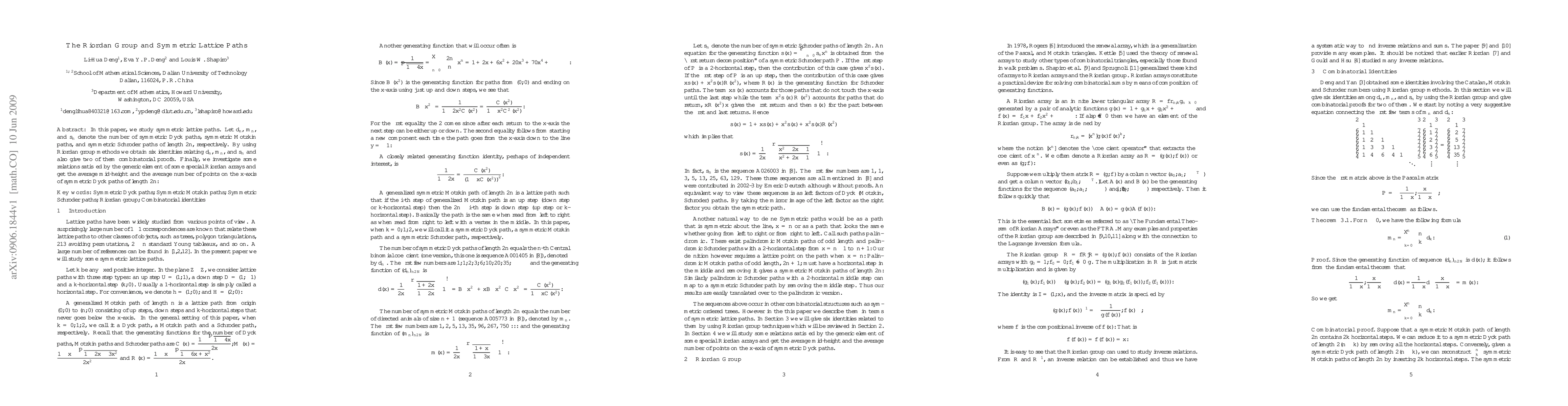 This paper uses Riordan group methods to derive six identities relating symmetric Dyck, Motzkin, and Schröder paths, providing combinatorial proofs for two. It also explores the average mid-height and x-axis points for symmetric Dyck paths.