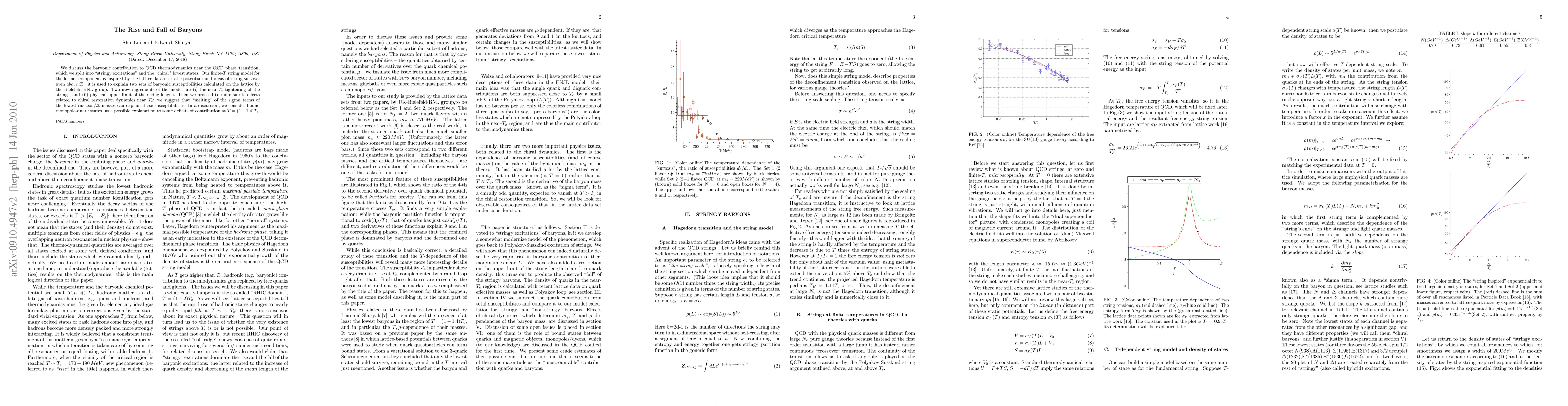 We discuss the baryonic contribution to QCD thermodynamics near the QCD phase transition, which we split into "stringy excitations" and the "chiral" lowest states. Our finite-$T$ string model for the former component is inspired by the lattice data on static potentials and ideas of string survival even $above$ $T_c$: it is used to explain two sets of baryonic susceptibilities calculated on the lattice by the Bielefeld-BNL group. Two new ingredients of the model are (i) the near-$T_c$ tightening of the strings, and (ii) physical upper limit of the string length. Then we proceed to more subtle effects related to chiral restoration dynamics near $T_c$: we suggest that "melting" of the sigma terms of the lowest nucleon/$\Delta$ masses can explain these susceptibilities. In a discussion, we consider bound monopole-quark states, as a possible explanation to some deficits of contribution at $T=(1-1.4)T_c$.