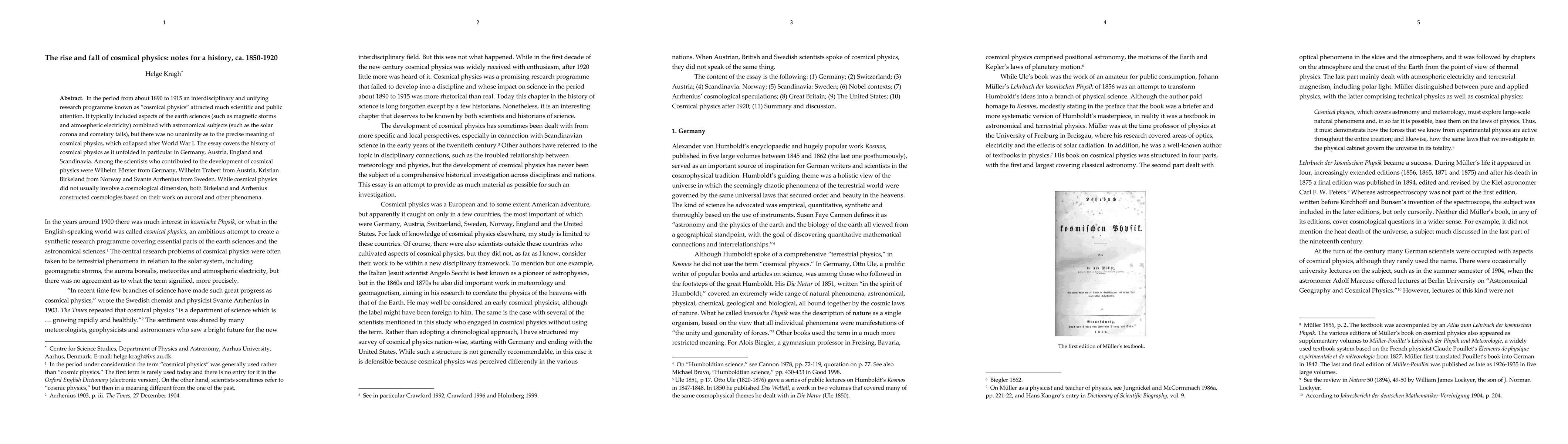 In the period from about 1890 to 1915 an interdisciplinary and unifying research programme known as "cosmical physics" attracted much scientific and public attention. It typically included aspects of the earth sciences (such as magnetic storms and atmospheric electricity) combined with astronomical subjects (such as the solar corona and cometary tails), but there was no unanimity as to the precise meaning of cosmical physics, which collapsed after World War I. The essay covers the history of cosmical physics as it unfolded in particular in Germany, Austria, England and Scandinavia. Among the scientists who contributed to the development of cosmical physics were Wilhelm Foerster from Germany, Wilhelm Trabert from Austria, Kristian Birkeland from Norway and Svante Arrhenius from Sweden. While cosmical physics did not usually involve a cosmological dimension, both Birkeland and Arrhenius constructed cosmologies based on their work on auroral and other phenomena.