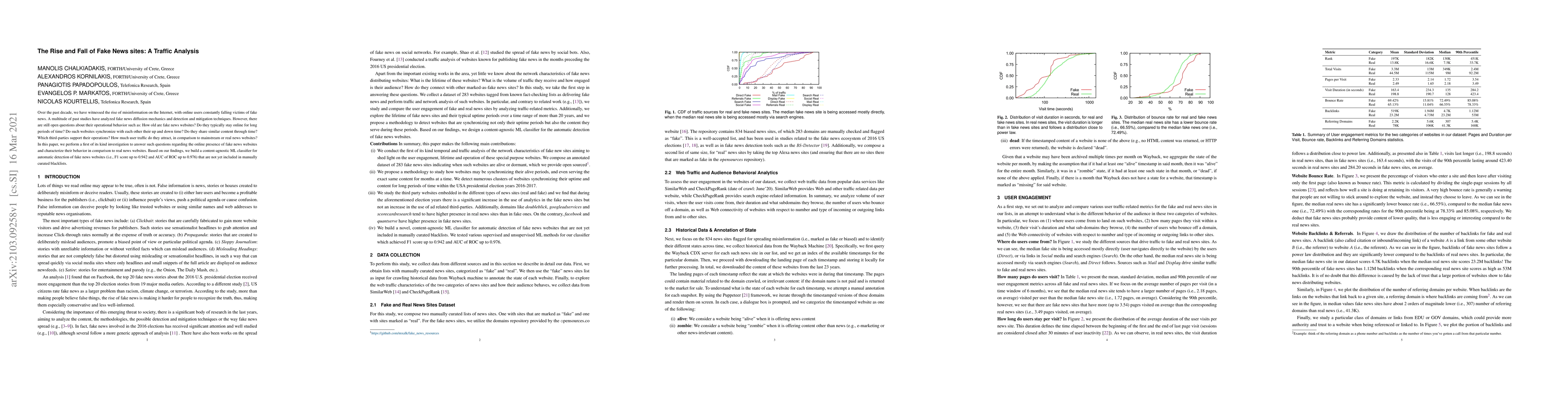 The study performed a traffic analysis of fake and real news websites, examining user engagement metrics and lifetimes of fake news sites over a 20-year period. The research also investigated potential synchronization of uptime and content among fake news sites and identified third-party trackers persistently embedded in these sites.