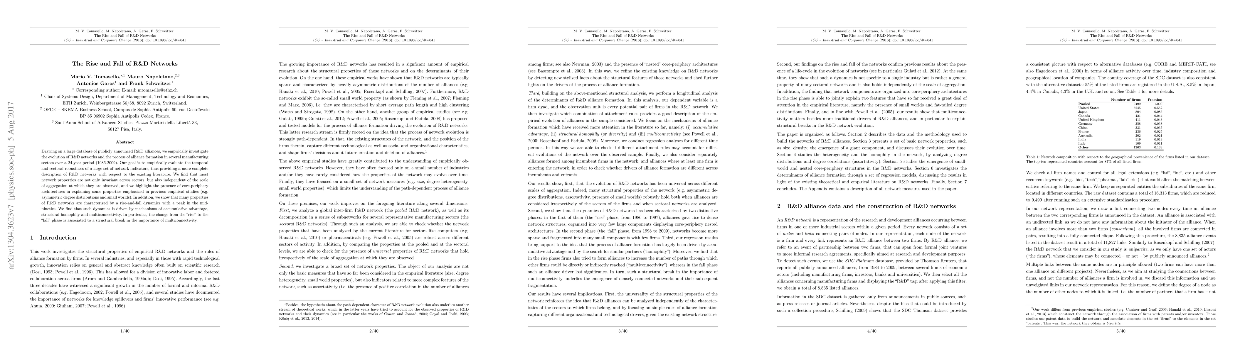 The paper introduces a detailed analysis of R&D network evolution using network indicators, revealing core-periphery architectures and rise-and-fall dynamics driven by accumulative advantage, structural homophily, and multiconnectivity.