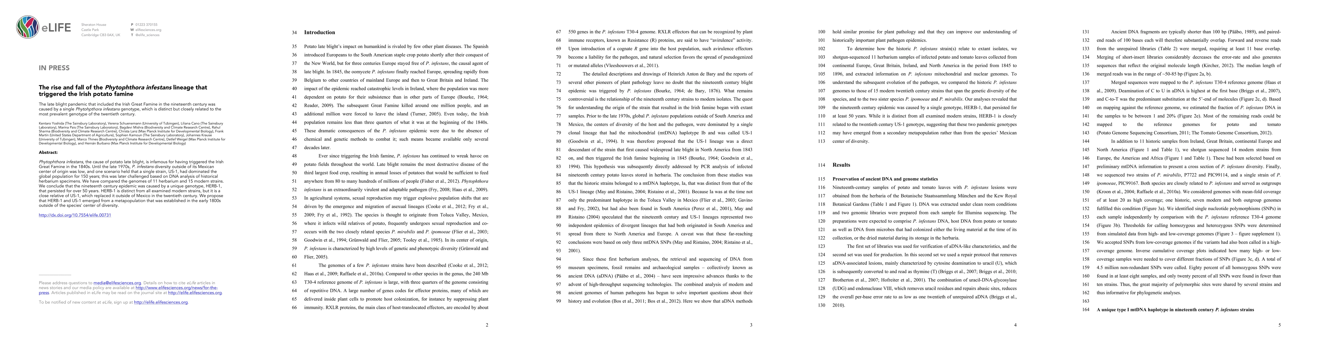A recent study identified a unique genotype, HERB-1, as the cause of the 1840s Irish potato famine, which persisted for over 50 years before being replaced by US-1 in the twentieth century.