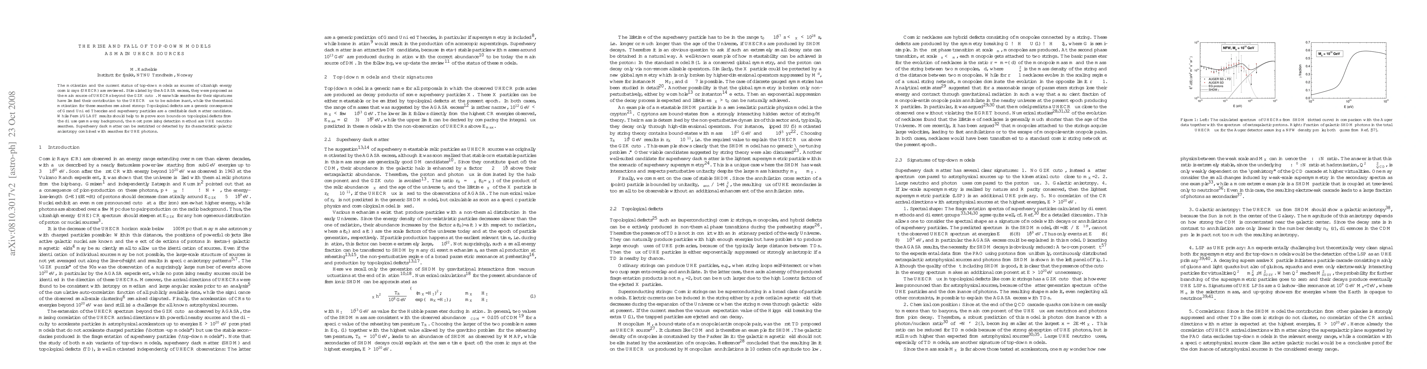 The motivation and the current status of top-down models as sources of ultrahigh energy cosmic rays (UHECR) are reviewed. Stimulated by the AGASA excess, they were proposed as the main source of UHECRs beyond the GZK cutoff. Meanwhile searches for their signatures have limited their contribution to the UHECR flux to be subdominant, while the theoretical motivation for these searches remained strong: Topological defects are a generic consequence of Grand Unified Theories and superheavy particles are a creditable dark matter candidate. While Fermi/GLAST results should help to improve soon bounds on topological defects from the diffuse gamma-ray background, the most promising detection method are UHE neutrino searches. Superheavy dark matter can be restricted or detected by its characteristic galactic anisotropy combined with searches for UHE photons.