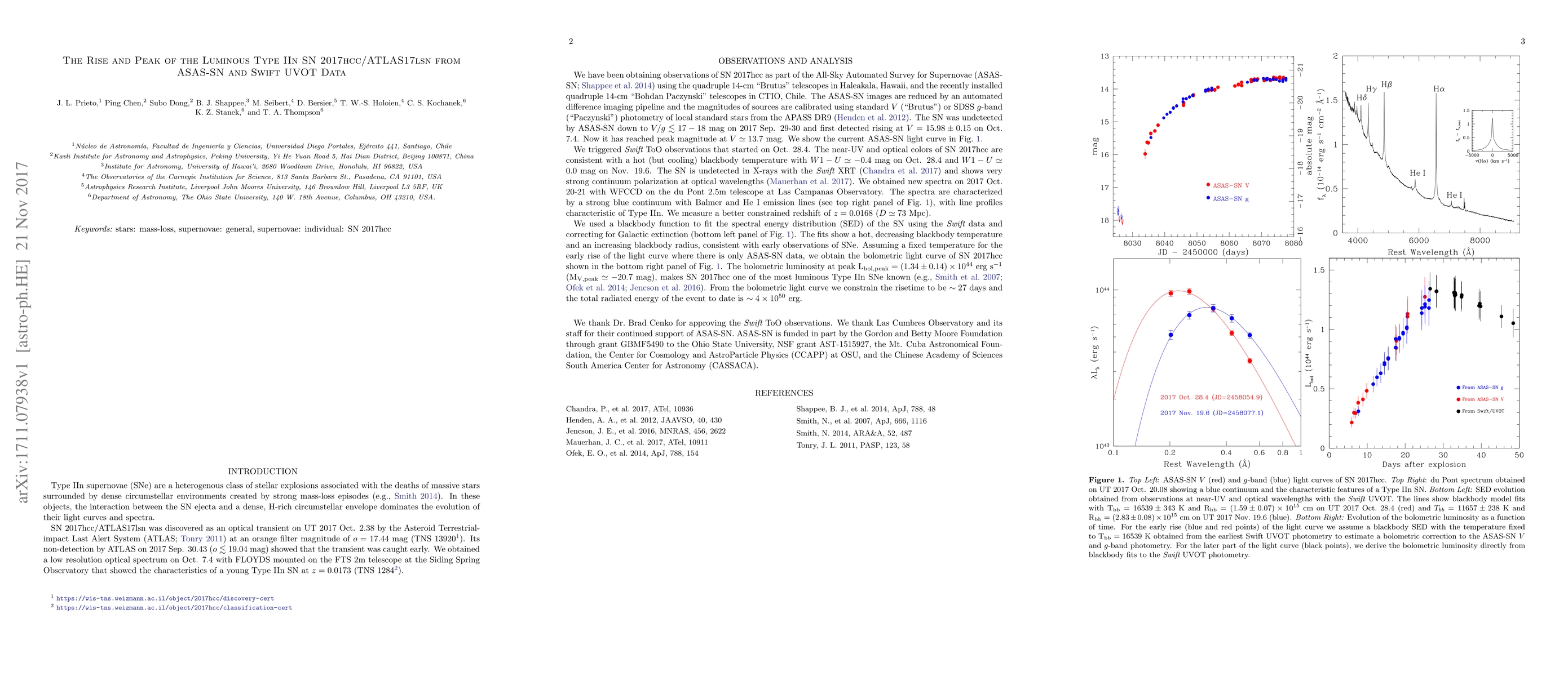 We present observations of the rise and peak of the Type IIn supernova SN 2017hcc/ATLAS17lsn obtained by the All-Sky Automated Survey for Supernovae (ASAS-SN) and Swift UVOT. The light curve of SN 2017hcc/ATLAS17lsn peaks at $V\simeq 13.7$ mag, which from the estimated redshift of the host galaxy ($z=0.0168$, $D\simeq 73$ Mpc) implies an absolute peak magnitude $M_{V,peak} \simeq -20.7$ mag. The near-UV to optical spectral energy distribution of SN 2017hcc/ATLAS17lsn from Swift UVOT is consistent with a hot, but cooling blackbody with $\rm T_{bb}\simeq 16500$ K on Oct. 28.4 and $\rm T_{bb} \simeq 11700$ K on Nov. 19.6. The estimated peak bolometric luminosity $L_{bol, peak}\simeq 1.3\times 10^{44}$ erg s$^{-1}$ makes SN2017hcc/ATLAS17lsn one of the most luminous Type IIn supernovae studied to date. From the bolometric light curve we constrain the risetime to be $\sim 27$ days and the total radiated energy of the event to date is $4\times 10^{50}$ erg.