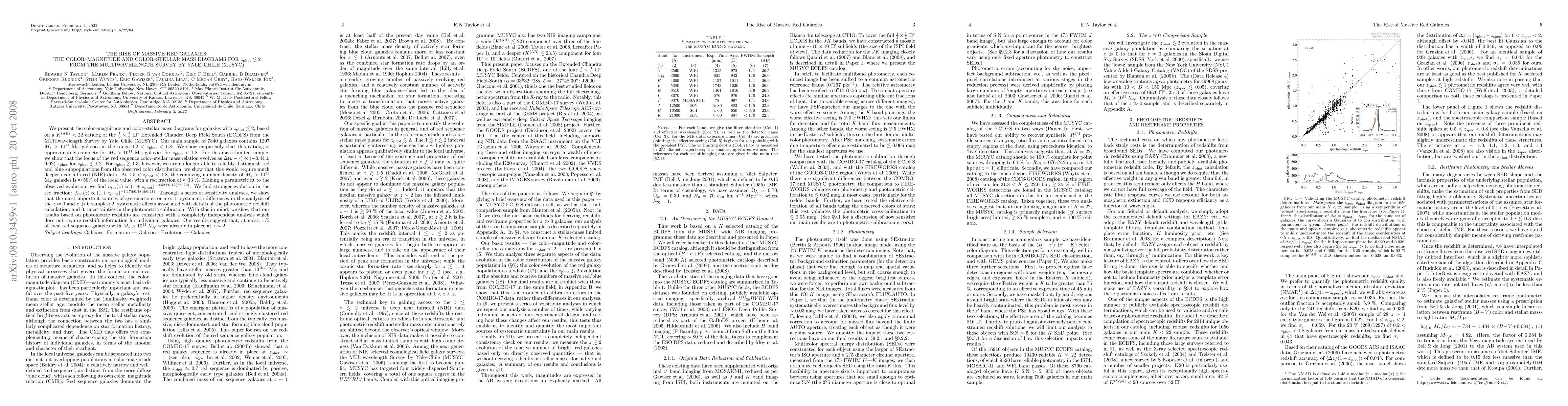 We present the color-magnitude and color-stellar mass diagrams for galaxies with z_phot < ~2, based on a K < 22 (AB) catalog of the Extended Chandra Deep Field South (ECDFS) from the MUltiwavelength Survey by Yale-Chile (MUSYC). Our main sample of 7840 galaxies contains 1297 M_* > 10^11 M_Sol galaxies in the range 0.2 < z_phot < 1.8. We show empirically that this catalog is approximately complete for M_* > 10^11 M_Sol galaxies for z_phot < 1.8. For this mass-limited sample, we show that the locus of the red sequence color-stellar mass relation evolves as Del(u-r) ~ (-0.44+/-0.02) z_phot for z_phot < ~1.2. For z_phot > ~1.3, however, we are no longer able to reliably distinguish red and blue subpopulations from the observed color distribution; we show that this would require much deeper near infrared data. At 1.5 < z_phot <1.8, the comoving number density of M_* > 10^11 M_Sol galaxies is ~50% of the local value, with a red fraction of ~33%. Making a parametric fit to the observed evolution, we find n_tot(z) ~ (1+z_phot)^(-0.52+/-0.12(+/-0.20)). We find stronger evolution in the red fraction: f_red(z) ~ (1+z_phot)^(-1.17+/-0.18(+/-0.21)). Through a series of sensitivity analyses, we show that the most important sources of systematic error are: 1. systematic differences in the analysis of the z~0 and z>>0 samples; 2. systematic effects associated with details of the photometric redshift calculation; and 3. uncertainties in the photometric calibration. With this in mind, we show that our results based on photometric redshifts are consistent with a completely independent analysis which does not require redshift information for individual galaxies. Our results suggest that, at most, 1/5 of local red sequence galaxies with M_* >10^11 M_Sol were already in place at z ~ 2.