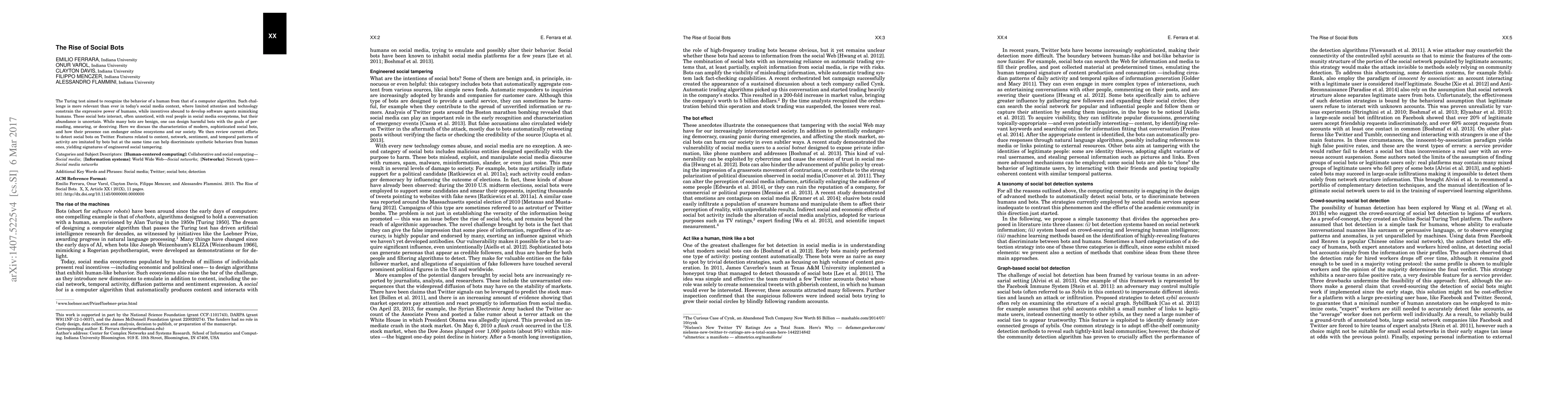 The Turing test aimed to recognize the behavior of a human from that of a computer algorithm. Such challenge is more relevant than ever in today's social media context, where limited attention and technology constrain the expressive power of humans, while incentives abound to develop software agents mimicking humans. These social bots interact, often unnoticed, with real people in social media ecosystems, but their abundance is uncertain. While many bots are benign, one can design harmful bots with the goals of persuading, smearing, or deceiving. Here we discuss the characteristics of modern, sophisticated social bots, and how their presence can endanger online ecosystems and our society. We then review current efforts to detect social bots on Twitter. Features related to content, network, sentiment, and temporal patterns of activity are imitated by bots but at the same time can help discriminate synthetic behaviors from human ones, yielding signatures of engineered social tampering.