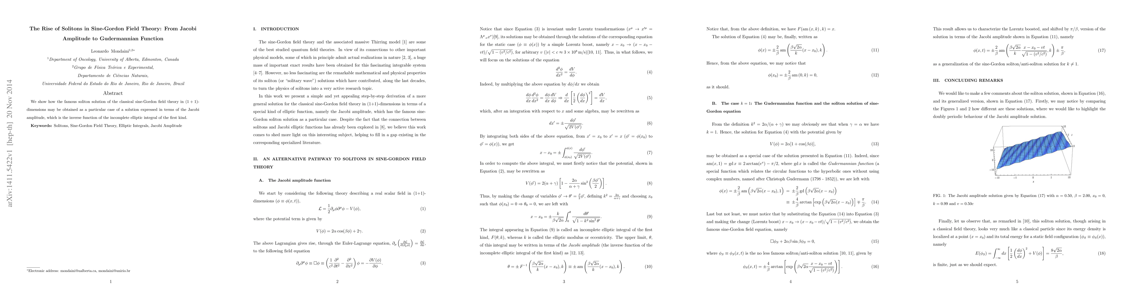 We show how the famous soliton solution of the classical sine-Gordon field theory in $(1+1)$-dimensions may be obtained as a particular case of a solution expressed in terms of the Jacobi amplitude, which is the inverse function of the incomplete elliptic integral of the first kind.
