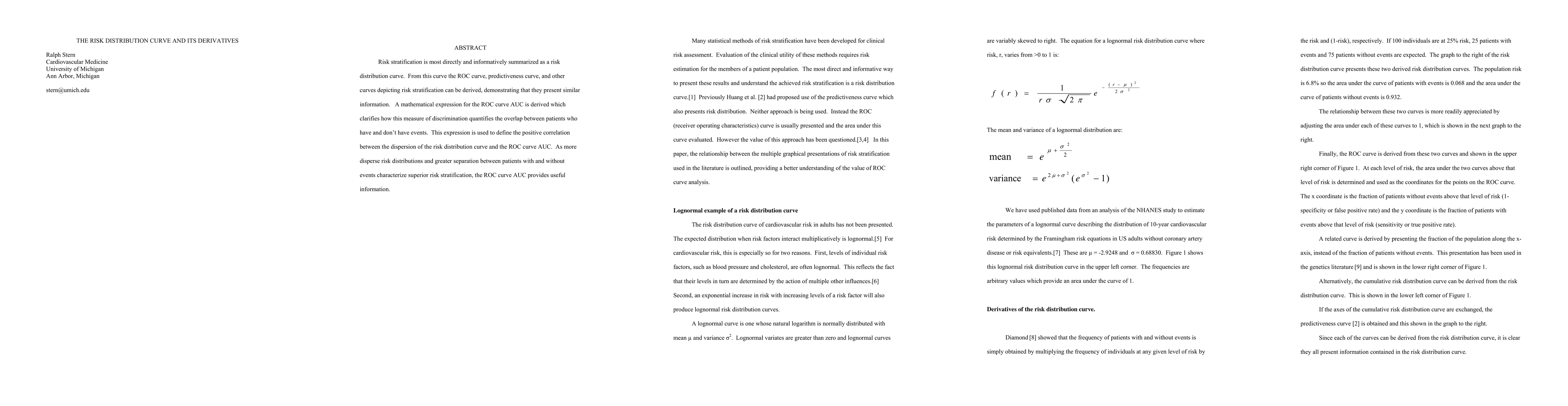 Risk stratification is most directly and informatively summarized as a risk distribution curve. From this curve the ROC curve, predictiveness curve, and other curves depicting risk stratification can be derived, demonstrating that they present similar information. A mathematical expression for the ROC curve AUC is derived which clarifies how this measure of discrimination quantifies the overlap between patients who have and don't have events. This expression is used to define the positive correlation between the dispersion of the risk distribution curve and the ROC curve AUC. As more disperse risk distributions and greater separation between patients with and without events characterize superior risk stratification, the ROC curve AUC provides useful information.