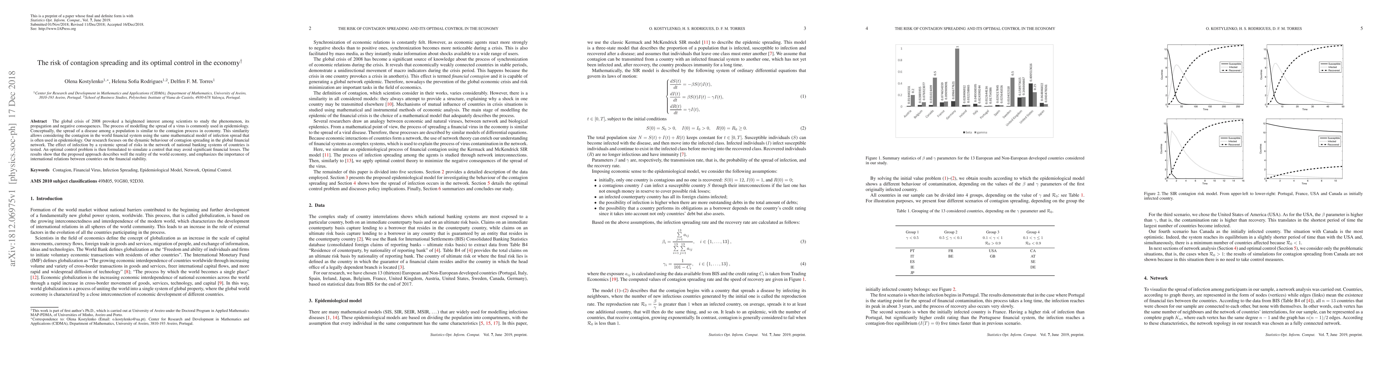 The global crisis of 2008 provoked a heightened interest among scientists to study the phenomenon, its propagation and negative consequences. The process of modelling the spread of a virus is commonly used in epidemiology. Conceptually, the spread of a disease among a population is similar to the contagion process in economy. This similarity allows considering the contagion in the world financial system using the same mathematical model of infection spread that is often used in epidemiology. Our research focuses on the dynamic behaviour of contagion spreading in the global financial network. The effect of infection by a systemic spread of risks in the network of national banking systems of countries is tested. An optimal control problem is then formulated to simulate a control that may avoid significant financial losses. The results show that the proposed approach describes well the reality of the world economy, and emphasizes the importance of international relations between countries on the financial stability.