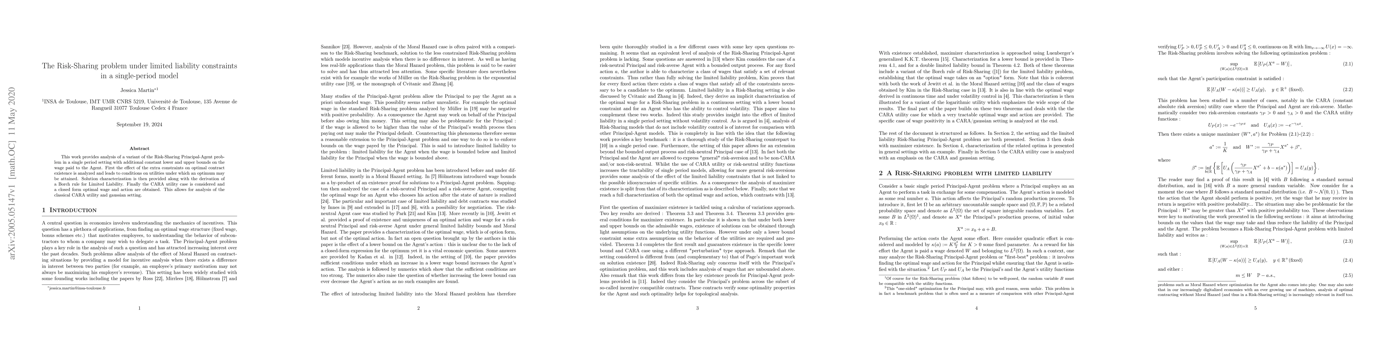 This work provides analysis of a variant of the Risk-Sharing Principal-Agent problem in a single period setting with additional constant lower and upper bounds on the wage paid to the Agent. First the effect of the extra constraints on optimal contract existence is analyzed and leads to conditions on utilities under which an optimum may be attained. Solution characterization is then provided along with the derivation of a Borch rule for Limited Liability. Finally the CARA utility case is considered and a closed form optimal wage and action are obtained. This allows for analysis of the classical CARA utility and gaussian setting.