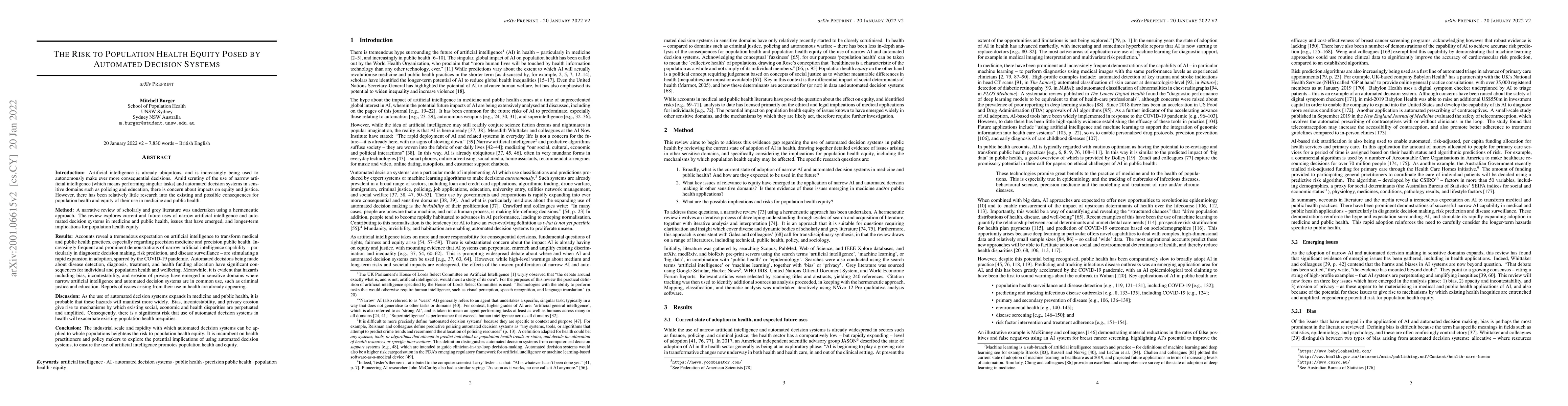 This paper reviews the potential risks posed by automated decision systems (ADS) in healthcare to population health equity, highlighting emerging issues like bias, incontestability, and privacy erosion. It warns that the rapid adoption of AI in medical and public health practices, especially in diagnostics and surveillance, could exacerbate existing health disparities unless carefully managed.