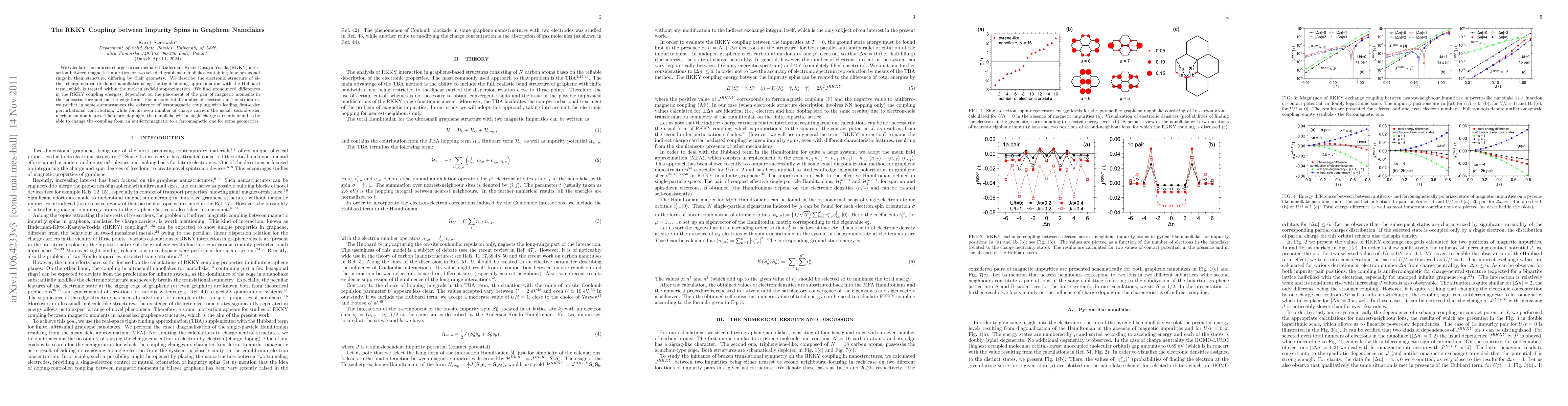 This paper investigates the RKKY interaction between magnetic impurities in two graphene nanoflakes, revealing significant differences in coupling energies dependent on geometry and edge form. Doping can switch the coupling from antiferromagnetic to ferromagnetic under certain conditions.