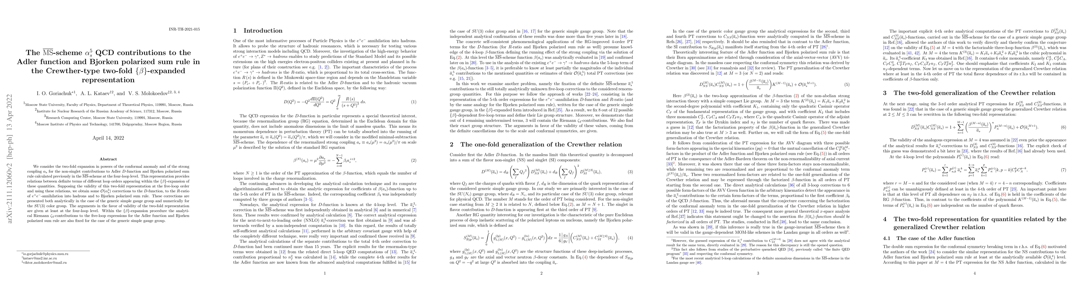 We consider the two-fold expansion in powers of the conformal anomaly and of the strong coupling $\alpha_s$ for the non-singlet contributions to Adler $D$-function and Bjorken polarized sum rule calculated previously in the $\MSbar$-scheme at the four-loop level. This representation provides relations between definite terms of different loop orders appearing within the $\{\beta\}$-expansion of these quantities. Supposing the validity of this two-fold representation at the five-loop order and using these relations, we obtain some $\mathcal{O}(\alpha_s^5)$ corrections to the $D$-function, to the $R$-ratio of $e^+e^-$-annihilation into hadrons and to Bjorken polarized sum rule. These corrections are presented both analytically in the case of the generic simple gauge group and numerically for the $SU(3)$ color group. The arguments in the favor of validity of the two-fold representation are given at least at the four-loop level. Within the $\{\beta\}$-expansion procedure the analytical Riemann $\zeta_4$-contributions to the five-loop expressions for the Adler function and Bjorken polarized sum rule are also fixed for the case of the generic simple gauge group.
