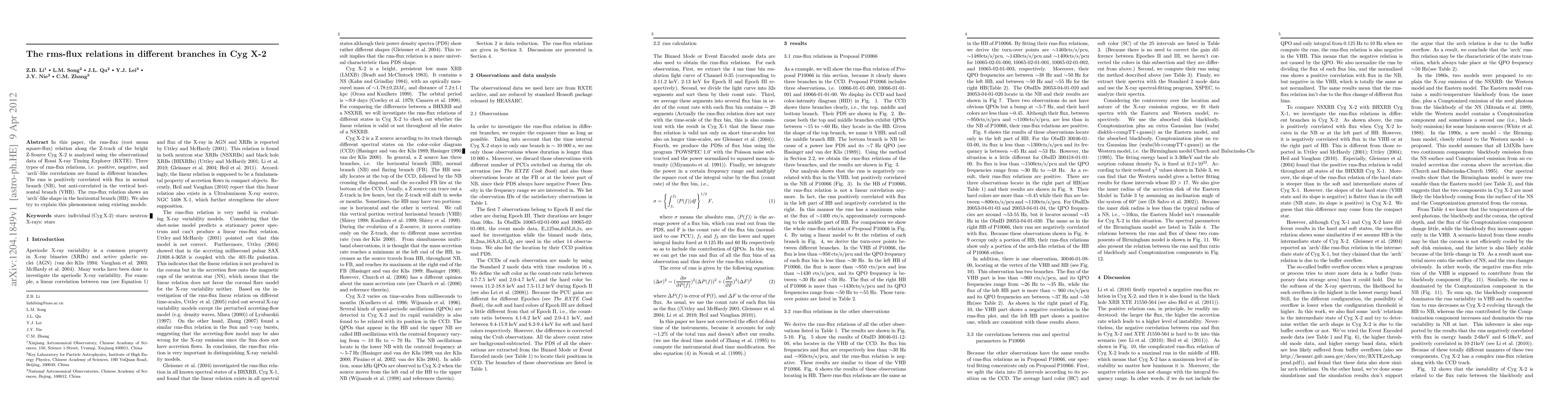This paper analyzes the rms-flux relations in Cyg X-2's Z-track using RXTE data, finding three distinct correlations: positive in the normal branch, anti-correlated in the vertical horizontal branch, and 'arch'-like in the horizontal branch. Existing models are used to explain these variations.