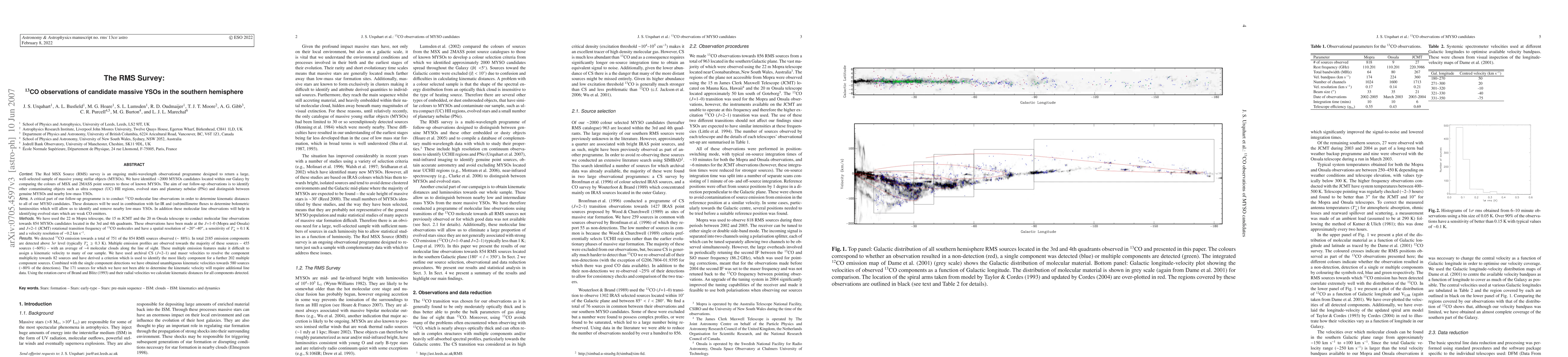 The RMS survey presents 13CO observations of 854 candidate massive young stellar objects (MYSOs) in the southern hemisphere, detecting emission in 751 sources (~88%). Multiple emission profiles complicate the assignment of kinematic velocities, but additional data resolves velocities for 580 sources, while 171 remain undetermined.