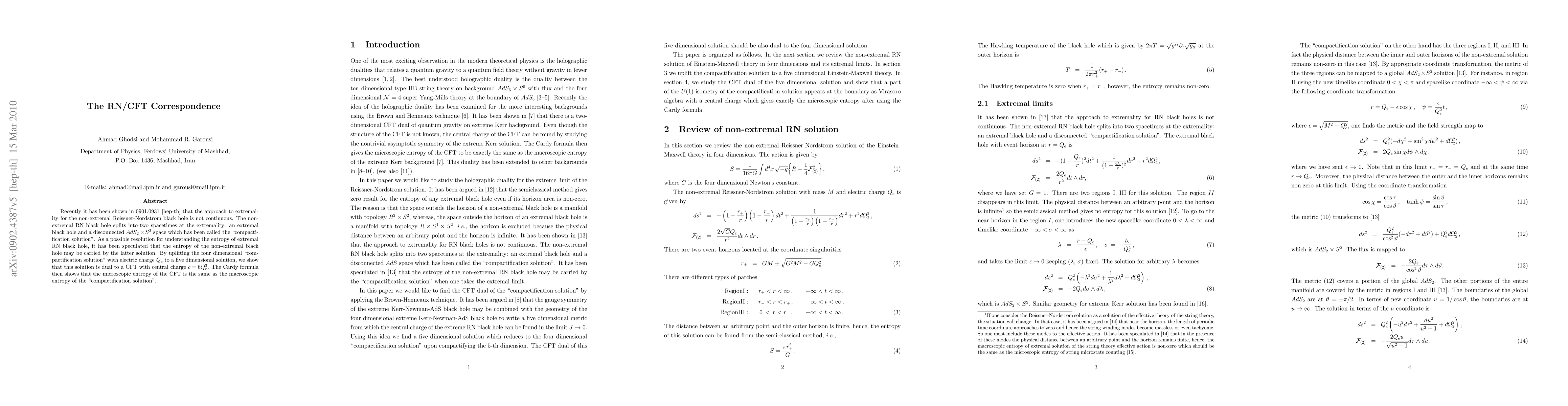 Recently it has been shown in 0901.0931 [hep-th] that the approach to extremality for the non-extremal Reissner-Nordstrom black hole is not continuous. The non-extremal RN black hole splits into two spacetimes at the extremality: an extremal black hole and a disconnected $AdS_2\times S^2$ space which has been called the "compactification solution". As a possible resolution for understanding the entropy of extremal RN black hole, it has been speculated that the entropy of the non-extremal black hole may be carried by the latter solution. By uplifting the four dimensional "compactification solution" with electric charge $Q_e$ to a five dimensional solution, we show that this solution is dual to a CFT with central charge $c=6Q_e^3$. The Cardy formula then shows that the microscopic entropy of the CFT is the same as the macroscopic entropy of the "compactification solution".