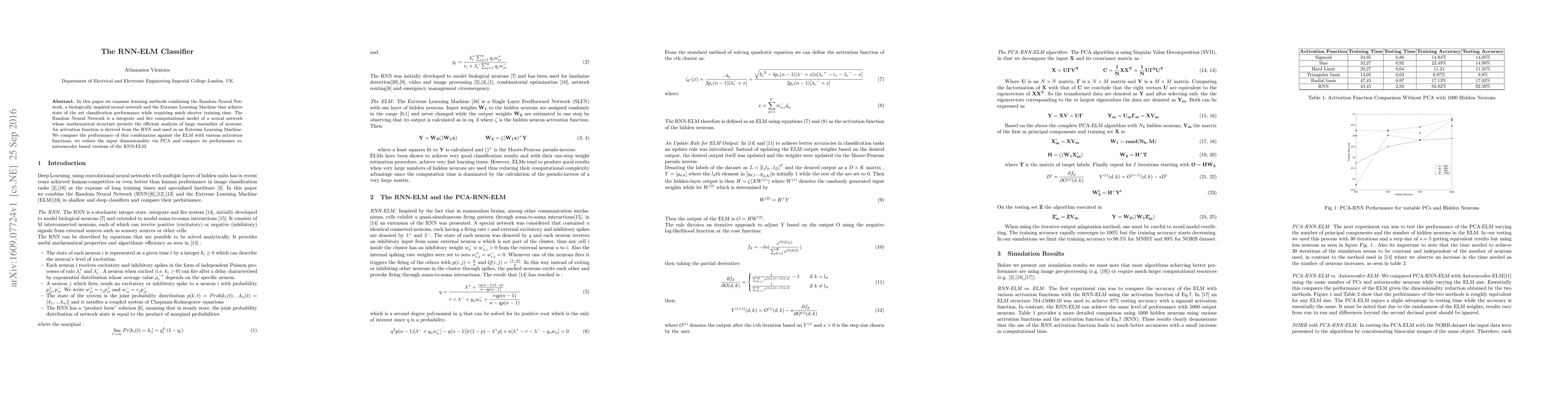 In this paper we examine learning methods combining the Random Neural Network, a biologically inspired neural network and the Extreme Learning Machine that achieve state of the art classification performance while requiring much shorter training time. The Random Neural Network is a integrate and fire computational model of a neural network whose mathematical structure permits the efficient analysis of large ensembles of neurons. An activation function is derived from the RNN and used in an Extreme Learning Machine. We compare the performance of this combination against the ELM with various activation functions, we reduce the input dimensionality via PCA and compare its performance vs. autoencoder based versions of the RNN-ELM.