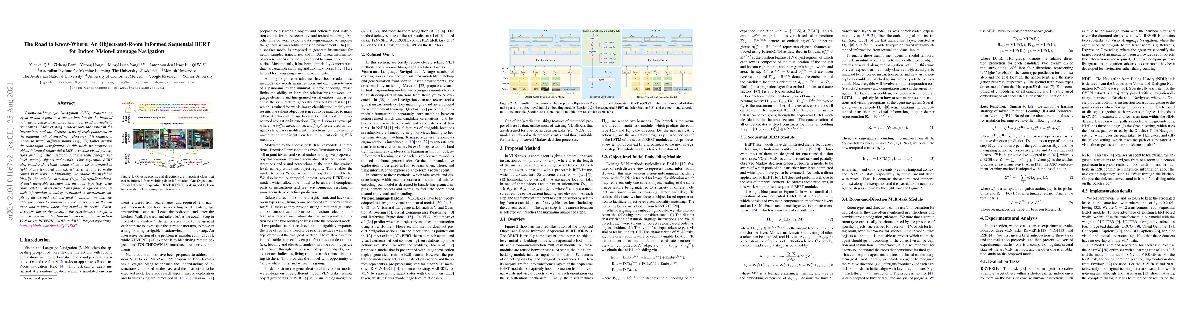 This paper proposes an object-and-room informed sequential BERT model for indoor vision-language navigation, which encodes visual and linguistic inputs at a fine-grained level of objects and words. This approach enhances the model's ability to interpret visual-textual clues in context, aiding in multi-round navigation tasks.