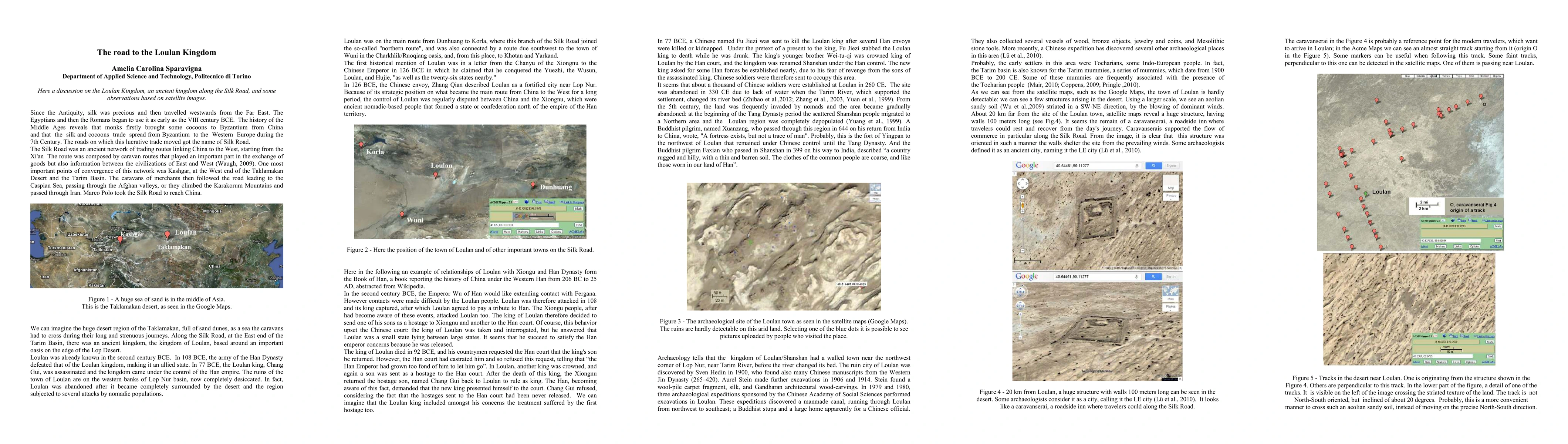 Summary: This paper explores the ancient Loulan Kingdom situated along the Silk Road, utilizing satellite imagery to provide new insights and observations about its historical significance and geographical context.