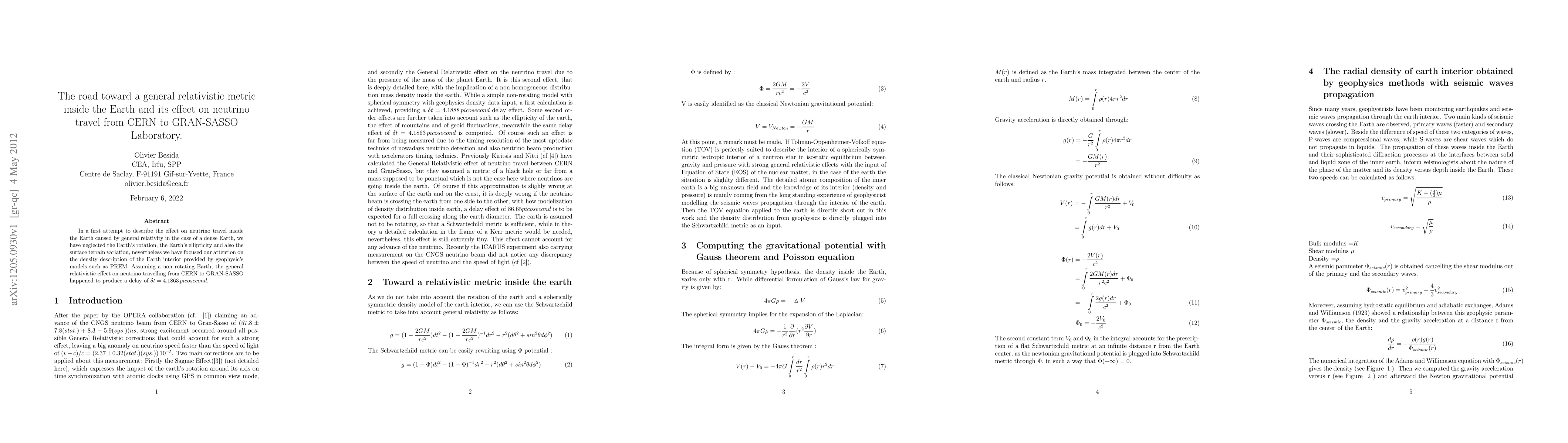 In a first attempt to describe the effect on neutrino travel inside the Earth caused by general relativity in the case of a dense Earth, we have neglected the Earth's rotation, the Earth's ellipticity and also the surface terrain variation, nevertheless we have focused our attention on the density description of the Earth interior provided by geophysic's models such as PREM. Assuming a non rotating Earth, the general relativistic effect on neutrino travelling from CERN to GRAN-SASSO happened to produce a delay of $\delta t=4.1863 \, picosecond$.