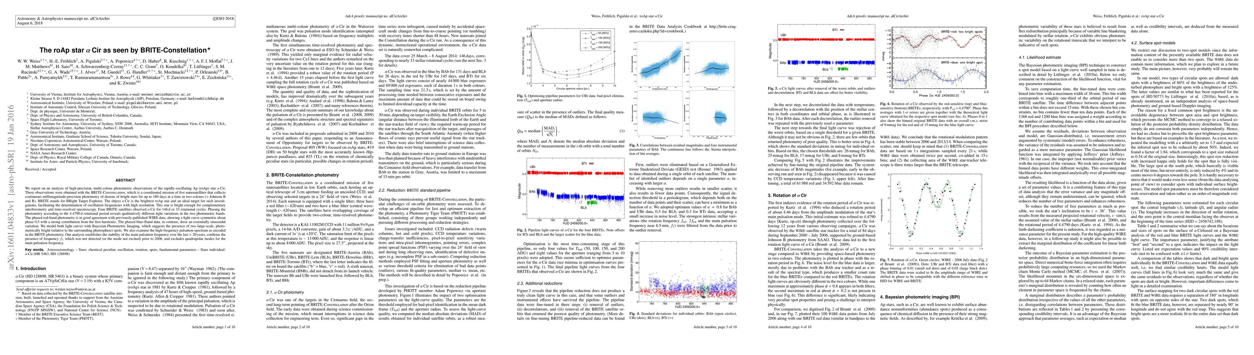 We report on an analysis of high-precision, multi-colour photometric observations of the rapidly-oscillating Ap (roAp) star $\alpha$ Cir. These observations were obtained with the BRITE-Constellation, which is a coordinated mission of five nanosatellites that collects continuous millimagnitude-precision photometry of dozens of bright stars for up to 180 days at a time in two colours (Johnson B and R). BRITE stands for BRight Target Explorer. The object $\alpha$ Cir is the brightest roAp star and an ideal target for such investigations, facilitating the determination of oscillation frequencies with high resolution. This star is bright enough for complementary interferometry and time-resolved spectroscopy. Four BRITE satellites observed $\alpha$ Cir for 146 d or 33 rotational cycles. Phasing the photometry according to the 4.4790 d rotational period reveals qualitatively different light variations in the two photometric bands. The phased red-band photometry is in good agreement with previously-published WIRE data, showing a light curve symmetric about phase 0.5 with a strong contribution from the first harmonic. The phased blue-band data, in contrast, show an essentially sinusoidal variation. We model both light curves with Bayesian Photometric Imaging, which suggests the presence of two large-scale, photometrically bright (relative to the surrounding photosphere) spots. We also examine the high-frequency pulsation spectrum as encoded in the BRITE photometry. Our analysis establishes the stability of the main pulsation frequency over the last 20 years, confirms the presence of frequency f7, which was not detected (or the mode not excited) prior to 2006, and excludes quadrupolar modes for the main pulsation frequency.