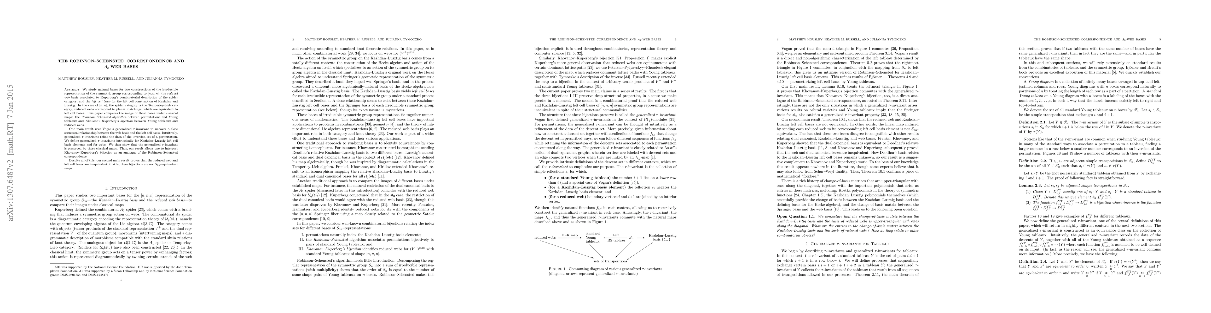 We study natural bases for two constructions of the irreducible representation of the symmetric group corresponding to $[n,n,n]$: the {\em reduced web} basis associated to Kuperberg's combinatorial description of the spider category; and the {\em left cell basis} for the left cell construction of Kazhdan and Lusztig. In the case of $[n,n]$, the spider category is the Temperley-Lieb category; reduced webs correspond to planar matchings, which are equivalent to left cell bases. This paper compares the images of these bases under classical maps: the {\em Robinson-Schensted algorithm} between permutations and Young tableaux and {\em Khovanov-Kuperberg's bijection} between Young tableaux and reduced webs. One main result uses Vogan's generalized $\tau$-invariant to uncover a close structural relationship between the web basis and the left cell basis. Intuitively, generalized $\tau$-invariants refine the data of the inversion set of a permutation. We define generalized $\tau$-invariants intrinsically for Kazhdan-Lusztig left cell basis elements and for webs. We then show that the generalized $\tau$-invariant is preserved by these classical maps. Thus, our result allows one to interpret Khovanov-Kuperberg's bijection as an analogue of the Robinson-Schensted correspondence. Despite all of this, our second main result proves that the reduced web and left cell bases are inequivalent; that is, these bijections are not $S_{3n}$-equivariant maps.