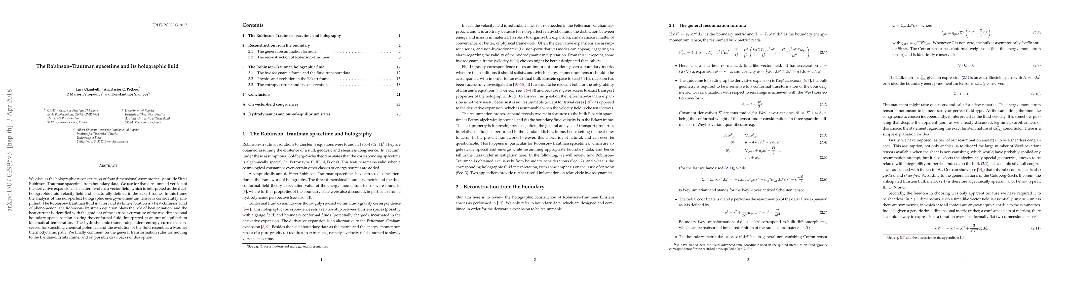 This paper reconstructs the four-dimensional asymptotically anti-de Sitter Robinson-Trautman spacetime using a resummed derivative expansion and interprets a vector field as the dual-holographic-fluid velocity in the Eckart frame. The fluid's evolution is akin to heat diffusion, with the entropy current conserved for zero chemical potential.