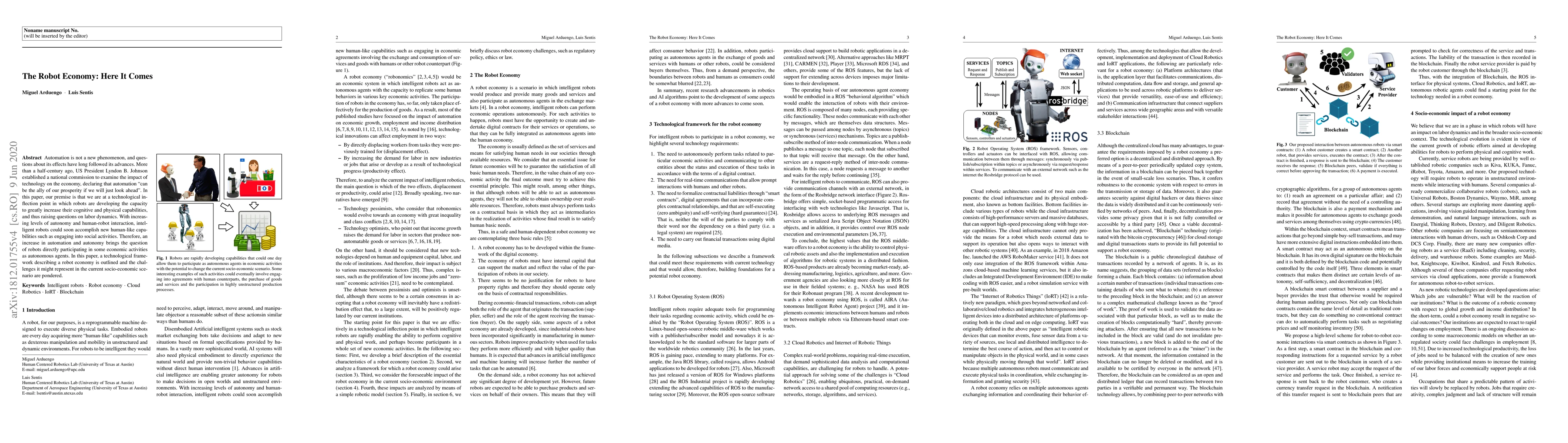 Automation is not a new phenomenon, and questions about its effects have long followed its advances. More than a half-century ago, US President Lyndon B. Johnson established a national commission to examine the impact of technology on the economy, declaring that automation "can be the ally of our prosperity if we will just look ahead". In this paper, our premise is that we are at a technological inflection point in which robots are developing the capacity to greatly increase their cognitive and physical capabilities, and thus raising questions on labor dynamics. With increasing levels of autonomy and human-robot interaction, intelligent robots could soon accomplish new human-like capabilities such as engaging into social activities. Therefore, an increase in automation and autonomy brings the question of robots directly participating in some economic activities as autonomous agents. In this paper, a technological framework describing a robot economy is outlined and the challenges it might represent in the current socio-economic scenario are pondered.