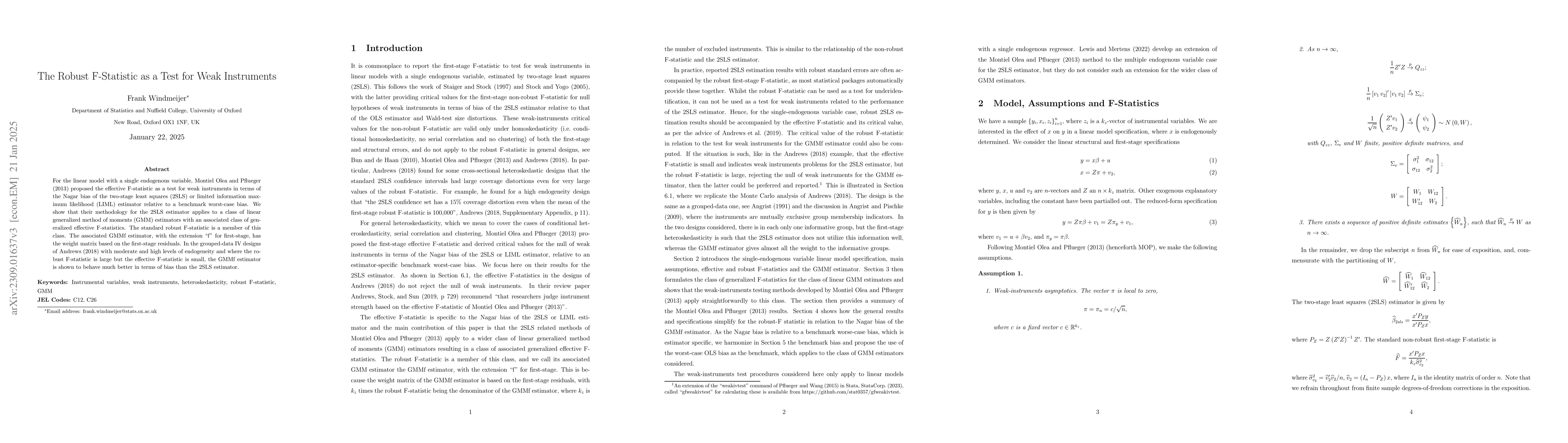 Montiel Olea and Pflueger's effective F-statistic is extended to a class of GMM estimators, showing the robust F-statistic can also test for underidentification without requiring simulations. The GMMf estimator, based on first-stage residuals, performs better than 2SLS in weak-instruments scenarios.
