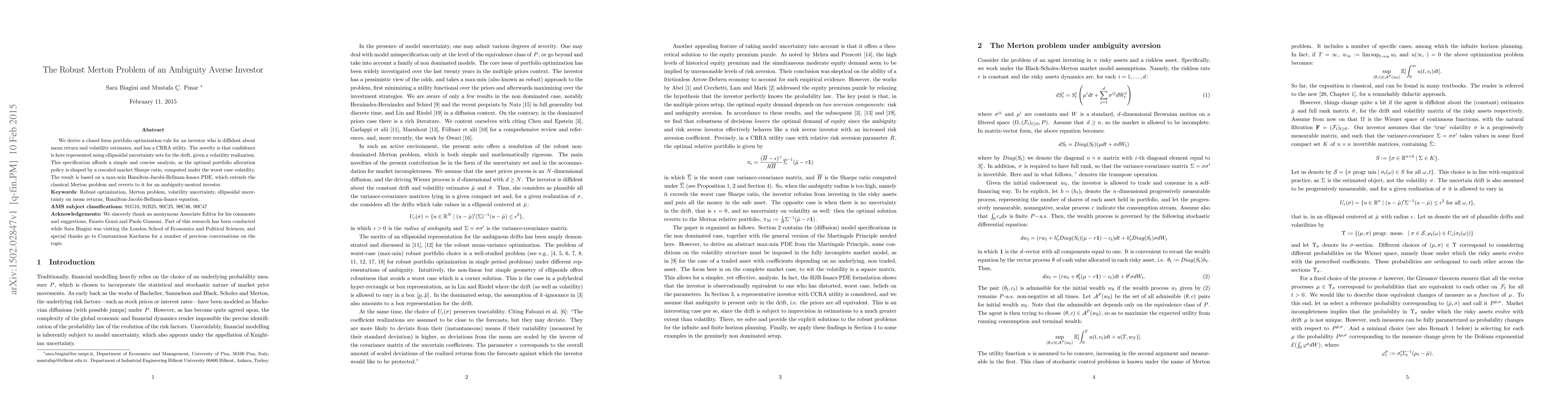 We derive a closed form portfolio optimization rule for an investor who is diffident about mean return and volatility estimates, and has a CRRA utility. The novelty is that confidence is here represented using ellipsoidal uncertainty sets for the drift, given a volatility realization. This specification affords a simple and concise analysis, as the optimal portfolio allocation policy is shaped by a rescaled market Sharpe ratio, computed under the worst case volatility. The result is based on a max-min Hamilton-Jacobi-Bellman-Isaacs PDE, which extends the classical Merton problem and reverts to it for an ambiguity-neutral investor.