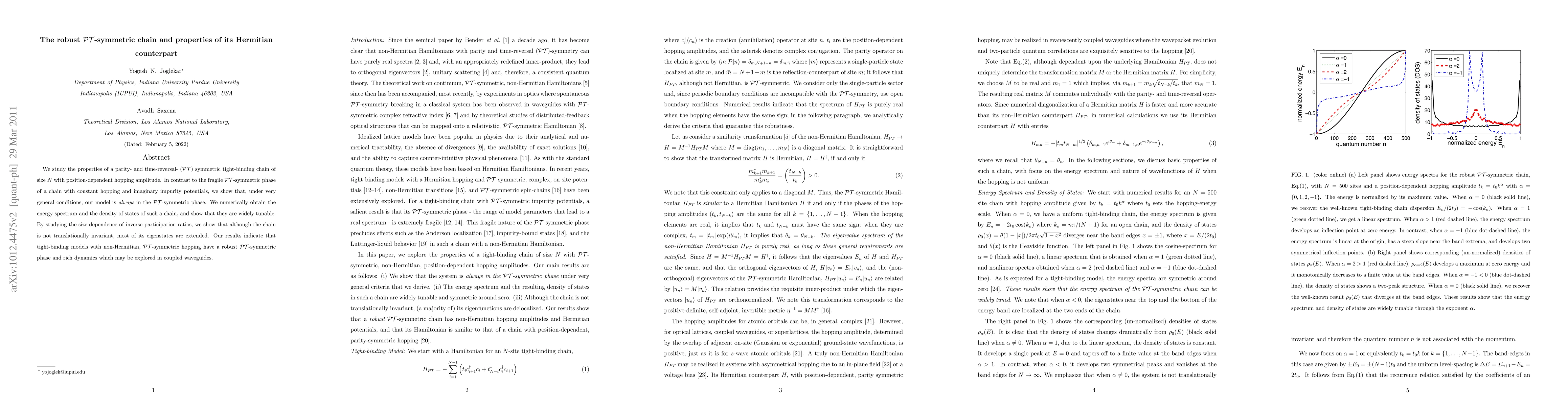 We study the properties of a parity- and time-reversal- (PT) symmetric tight-binding chain of size N with position-dependent hopping amplitude. In contrast to the fragile PT-symmetric phase of a chain with constant hopping and imaginary impurity potentials, we show that, under very general conditions, our model is {\it always} in the PT-symmetric phase. We numerically obtain the energy spectrum and the density of states of such a chain, and show that they are widely tunable. By studying the size-dependence of inverse participation ratios, we show that although the chain is not translationally invariant, most of its eigenstates are extended. Our results indicate that tight-binding models with non-Hermitian PT-symmetric hopping have a robust PT-symmetric phase and rich dynamics which may be explored in coupled waveguides.