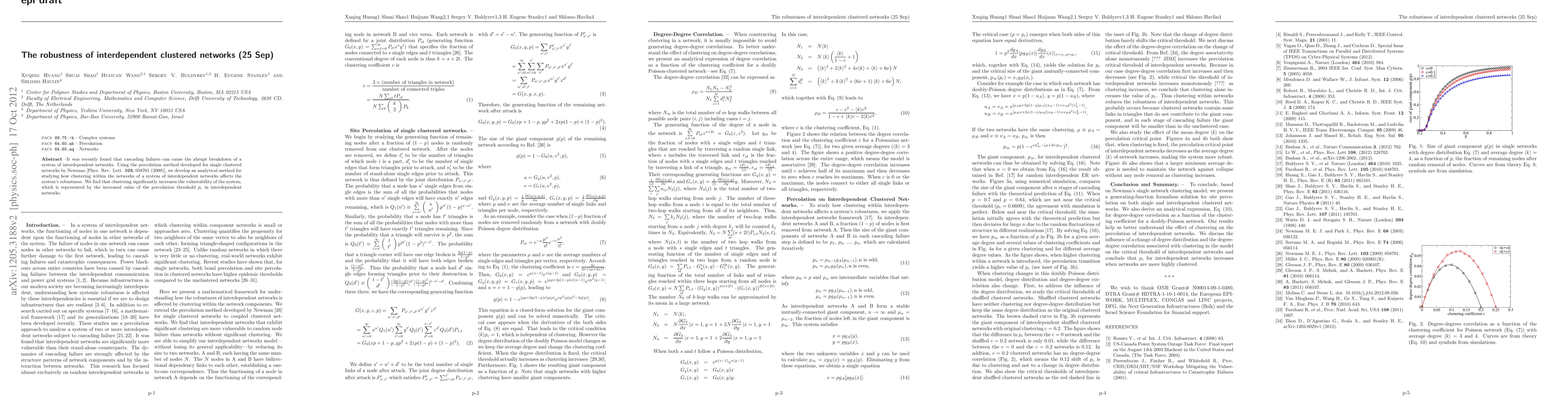 This work extends Newman's single network clustering model to interdependent networks, providing new insights into how clustering affects robustness in such systems.