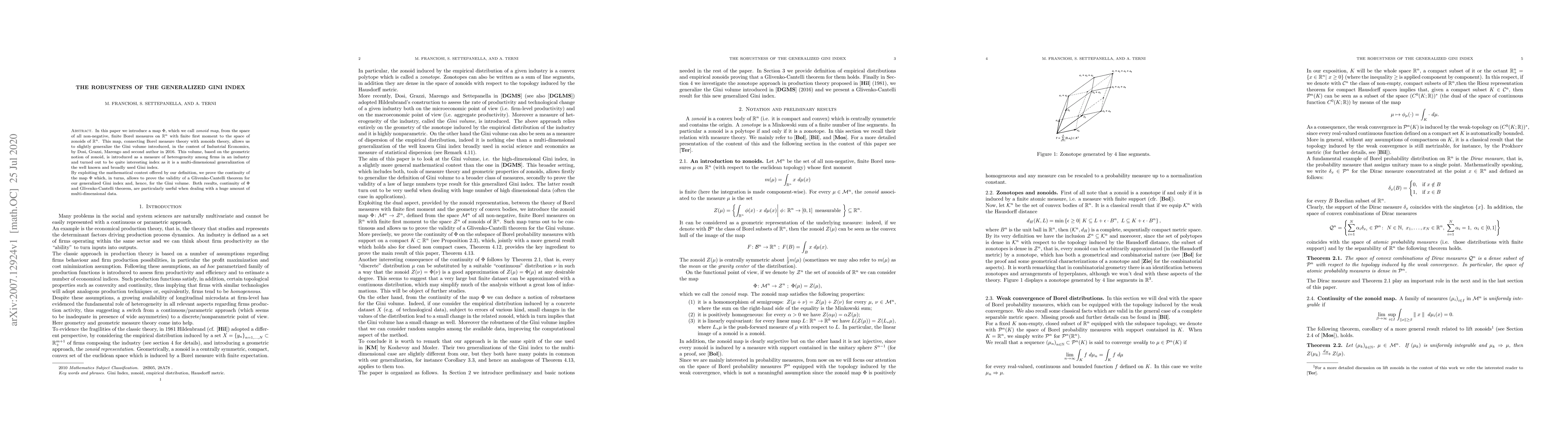 In this paper we introduce a map $\Phi$, which we call \textit{zonoid map}, from the space of all non-negative, finite Borel measures on $\mathbb{R}^n$ with finite first moment to the space of zonoids of $\mathbb{R}^n$. This map, connecting Borel measure theory with zonoids theory, allows us to slightly generalize the Gini volume introduced, in the contest of Industrial Economics, by Dosi, Grazzi, Marengo and second author in 2016. This volume, based on the geometric notion of zonoid, is introduced as a measure of heterogeneity among firms in an industry and turned out to be quite interesting index as it is a multi-dimensional generalization of the well known and broadly used Gini index. By exploiting the mathematical contest offered by our definition, we prove the continuity of the map $\Phi$ which, in turns, allows to prove the validity of a Glivenko-Cantelli theorem for our generalized Gini index and, hence, for the Gini volume. Both results, continuity of $\Phi$ and Glivenko-Cantelli theorem, are particularly useful when dealing with a huge amount of multi-dimensional data.