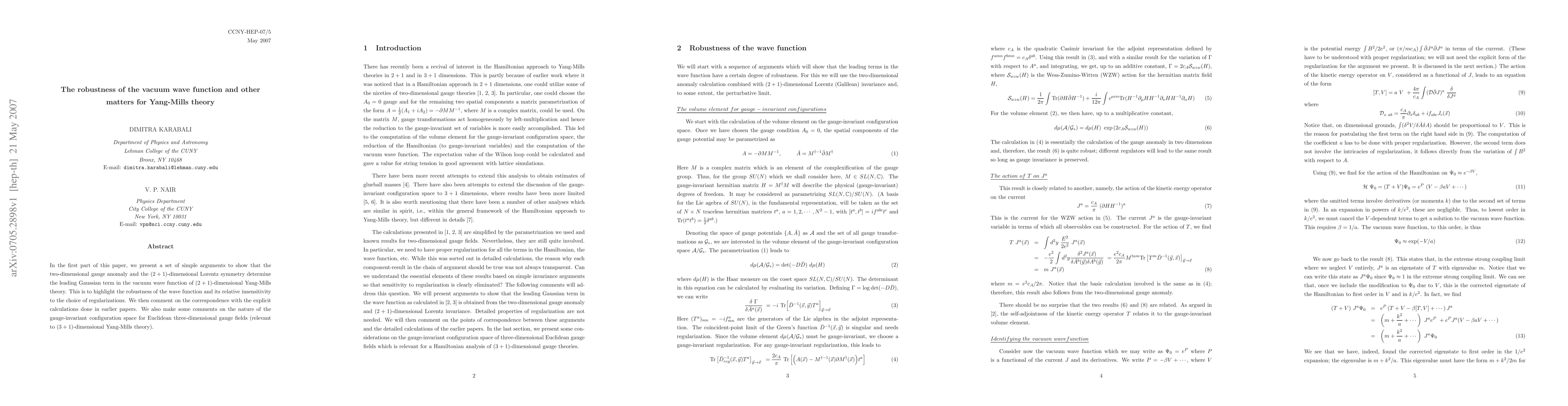In the first part of this paper, we present a set of simple arguments to show that the two-dimensional gauge anomaly and the (2+1)-dimensional Lorentz symmetry determine the leading Gaussian term in the vacuum wave function of (2+1)-dimensional Yang-Mills theory. This is to highlight the robustness of the wave function and its relative insensitivity to the choice of regularizations. We then comment on the correspondence with the explicit calculations done in earlier papers. We also make some comments on the nature of the gauge-invariant configuration space for Euclidean three-dimensional gauge fields (relevant to (3+1)-dimensional Yang-Mills theory).
