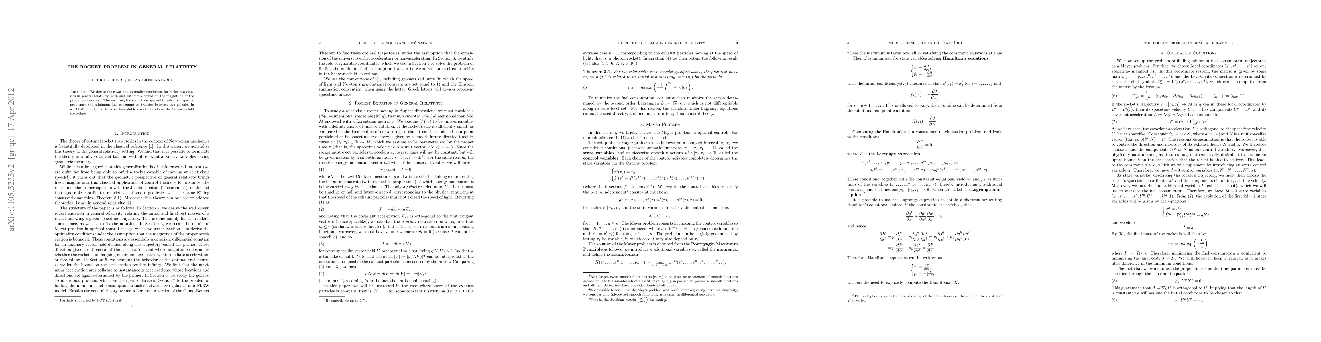 We derive the covariant optimality conditions for rocket trajectories in general relativity, with and without a bound on the magnitude of the proper acceleration. The resulting theory is then applied to solve two specific problems: the minimum fuel consumption transfer between two galaxies in a FLRW model, and between two stable circular orbits in the Schwarzschild spacetime.