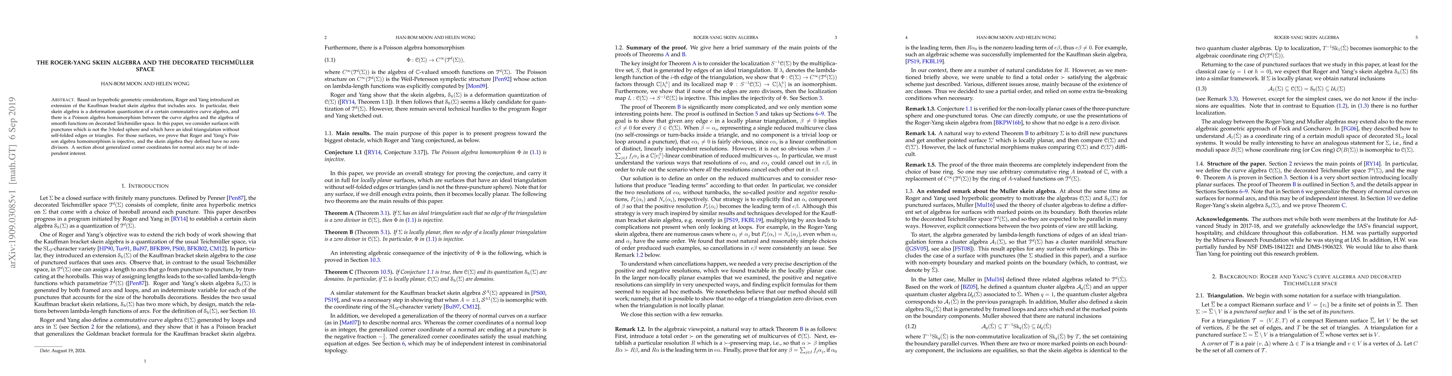 Based on hyperbolic geometric considerations, Roger and Yang introduced an extension of the Kauffman bracket skein algebra that includes arcs. In particular, their skein algebra is a deformation quantization of a certain commutative curve algebra, and there is a Poisson algebra homomorphism between the curve algebra and the algebra of smooth functions on decorated Teichmuller space. In this paper, we consider surfaces with punctures which is not the 3-holed sphere and which have an ideal triangulation without self-folded edges or triangles. For those surfaces, we prove that Roger and Yang's Poisson algebra homomorphism is injective, and the skein algebra they defined have no zero divisors. A section about generalized corner coordinates for normal arcs may be of independent interest.