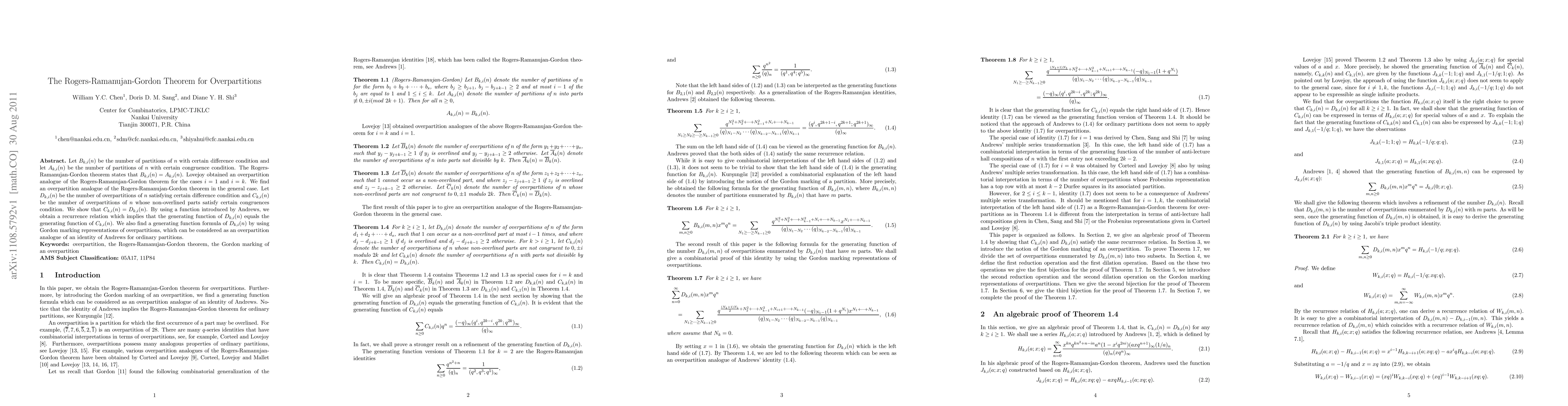The paper extends the Rogers-Ramanujan-Gordon theorem to overpartitions, proving that the number of overpartitions satisfying a difference condition equals the number satisfying a congruence condition. A recurrence relation and generating function formula are derived using techniques from partition theory.