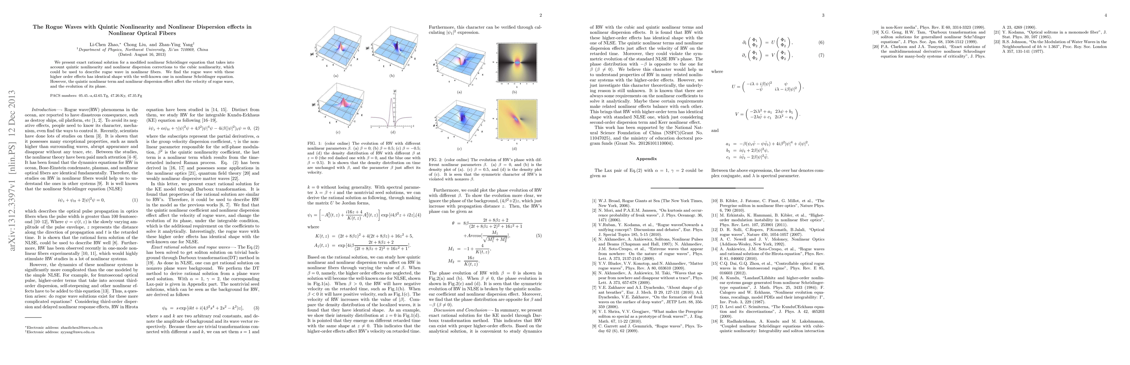 This paper presents an exact rational solution for a modified nonlinear Schrödinger equation incorporating quintic nonlinearity and nonlinear dispersion, which describes rogue waves in optical fibers. While the rogue wave shape remains similar, the quintic term and nonlinear dispersion alter the wave's velocity and phase evolution.