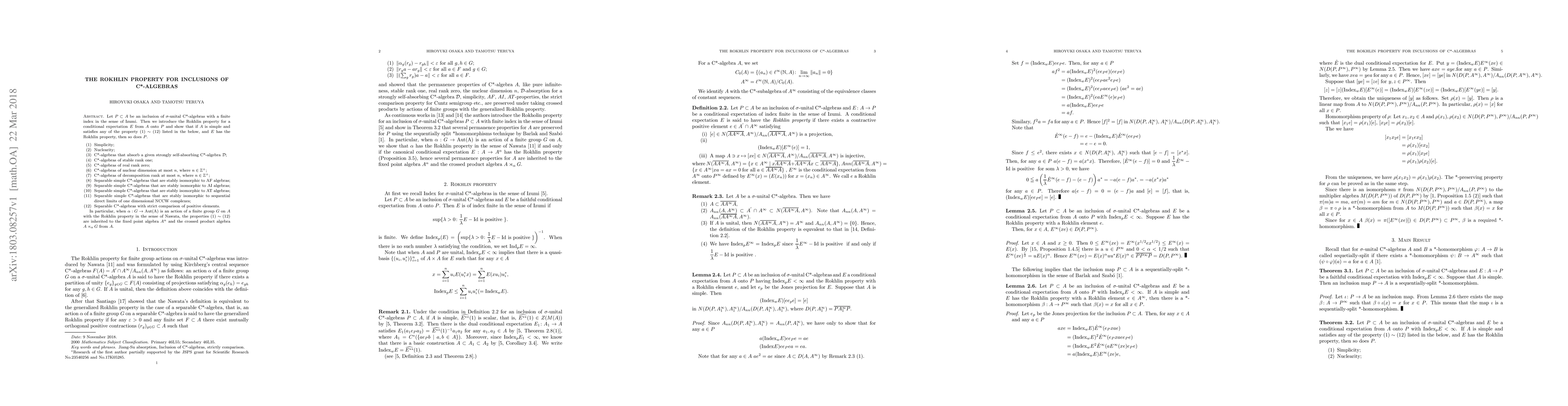 Let $P \subset A$ be an inclusion of $\sigma$-unital C*-algebras with a finite index in the sense of Izumi. Then we introduce the Rokhlin property for a conditional expectation $E$ from $A$ onto $P$ and show that if $A$ is simple and satisfies any of the property $(1) \sim (12)$ listed in the below, and $E$ has the Rokhlin property, then so does $P$. (1) Simplicity;(2) Nuclearity;(3) C*-algebras that absorb a given strongly self-absorbing C*-algebra $\mathcal{D}$; (4)C*-algebras of stable rank one; (5) C*-algebras of real rank zero;(6) C*-algebras of nuclear dimension at most $n$, where $n \in Z^+$; (7)C*-algebras of decomposition rank at most $n$, where $n \in Z^+$; (8) Separable simple C*-algebras that are stably isomorphic to AF algebras; (9) Separable simple C*-algebras that are stably isomorphic to AI algebras; (10) Separable simple C*-algebras that are stably isomorphic to AT algebras; (11) Separable simple C*-algebras that are stably isomorphic to sequential direct limits of one dimensional NCCW complexes; (12) Separable C*-algebras with strict comparison of positive elements. In particular, when $\alpha : G \rightarrow \rm{Aut}(A)$ is an action of a finite group $G$ on $A$ with the Rokhlin property in the sense of Nawata, the properties $(1) \sim (12)$ are inherited to the fixed point algebra $A^\alpha$ and the crossed product algebra $A \rtimes_\alpha G$ from $A$.