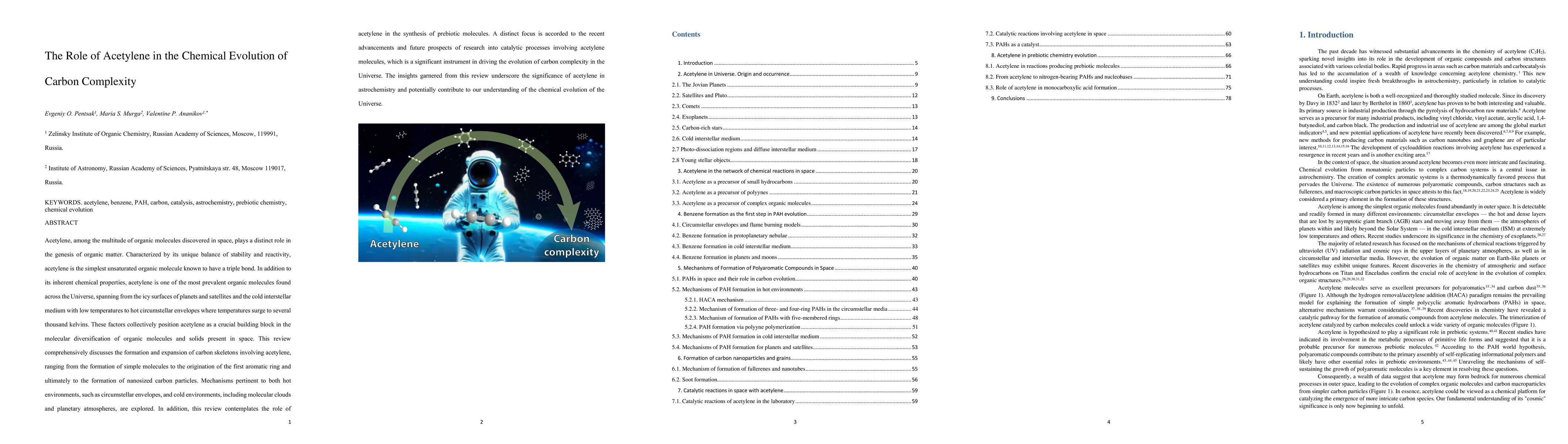 This paper reviews acetylene's pivotal role in the formation and diversification of organic molecules and solids in space, highlighting its presence in various environments from cold molecular clouds to hot circumstellar envelopes. It emphasizes acetylene's contribution to the synthesis of prebiotic molecules and nanosized carbon particles, and explores recent advancements in catalytic processes involving acetylene to drive carbon complexity evolution.